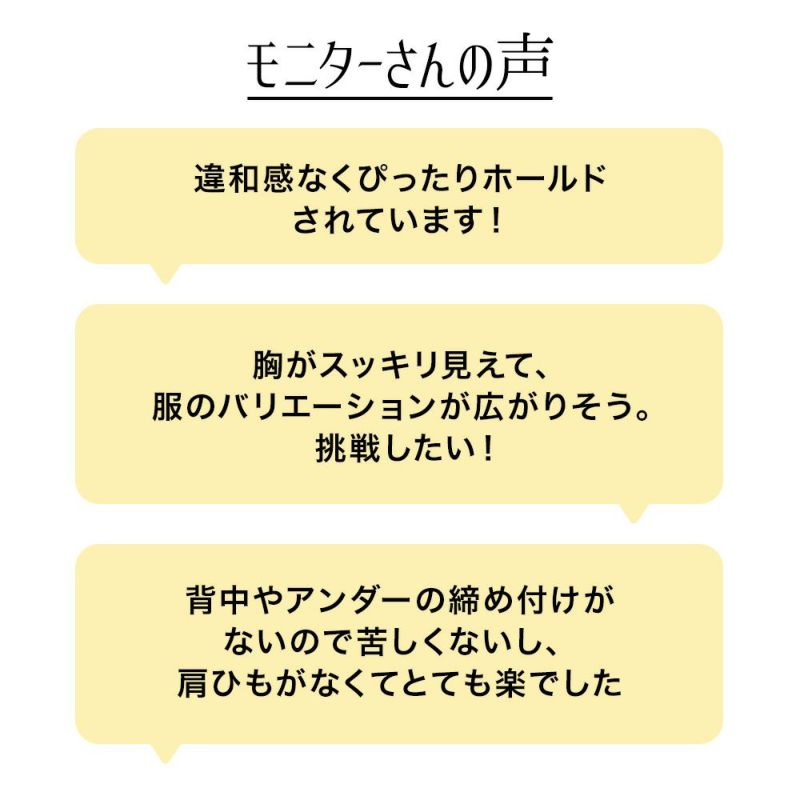 肩紐の煩わしさがなくて、とても楽です。胸も綺麗に見えて、これからはいろんなお洋服が楽しめそうです。これはおすすめです。