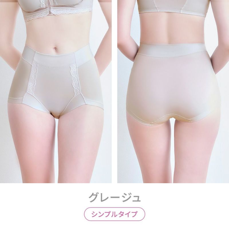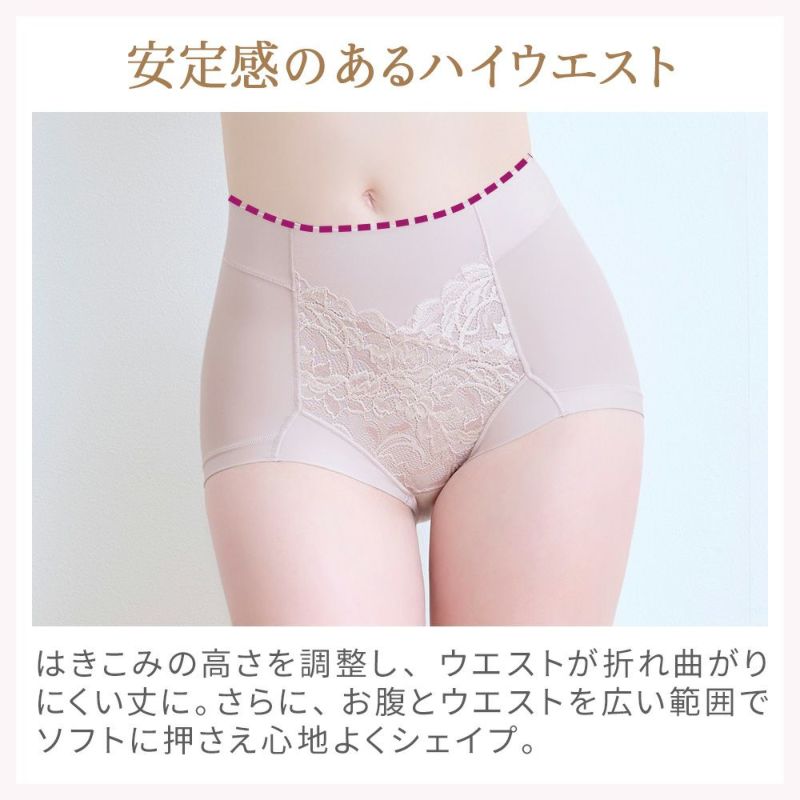 お腹部分は三枚重ねのお腹押さえ仕様でパワーネットを挟み込み、適度な締め付け感で幅広くお腹を押さえます。ウエスト部分はゴムや切り替えがなく、身生地を折り返した二重仕様で苦しくなく、前身頃のウエストからお腹部分の肌側にかけて、接ぎのない一枚仕立てで優しい肌当たりです。