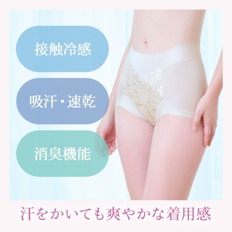 身生地は、美しい光沢感と優しい肌あたりのナイロン綿ベア天竺素材を使用。ナイロン綿ベア天竺には接触冷感機能や、吸汗性と速乾性もあるので汗ばむ季節も快適です。さらにクロッチの肌側には汗臭(アンモニア、酢酸、イソ吉草酸)の消臭機能を備えています。
