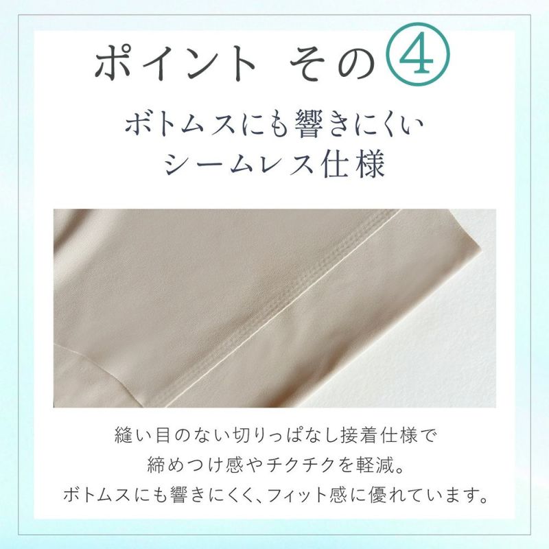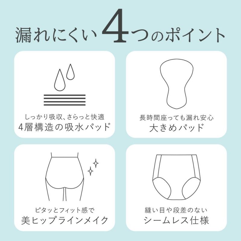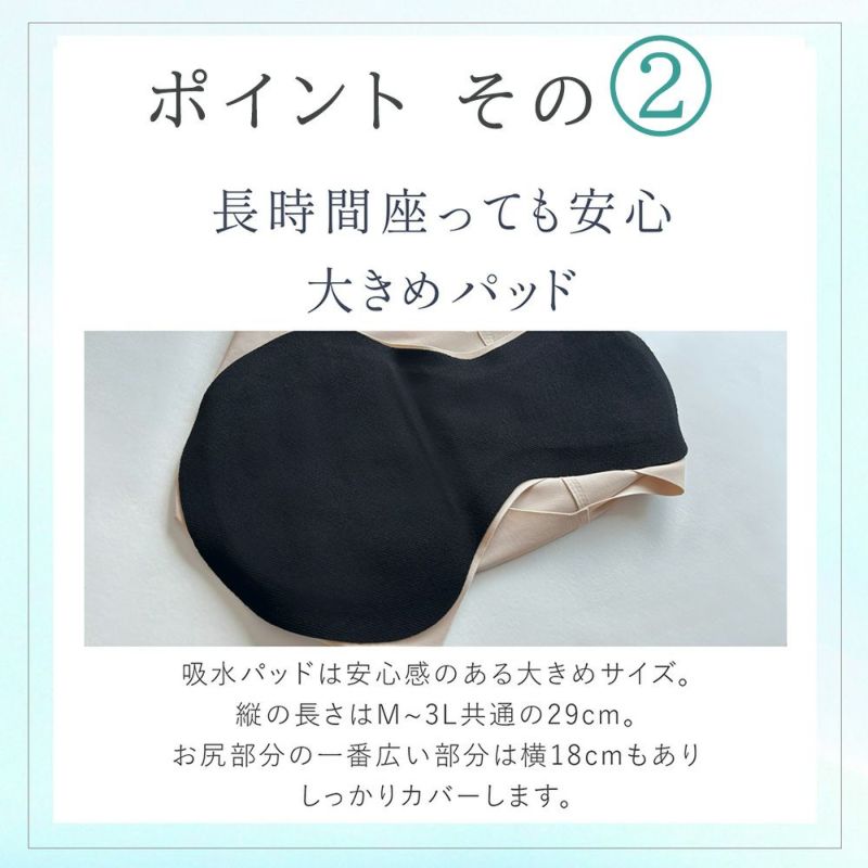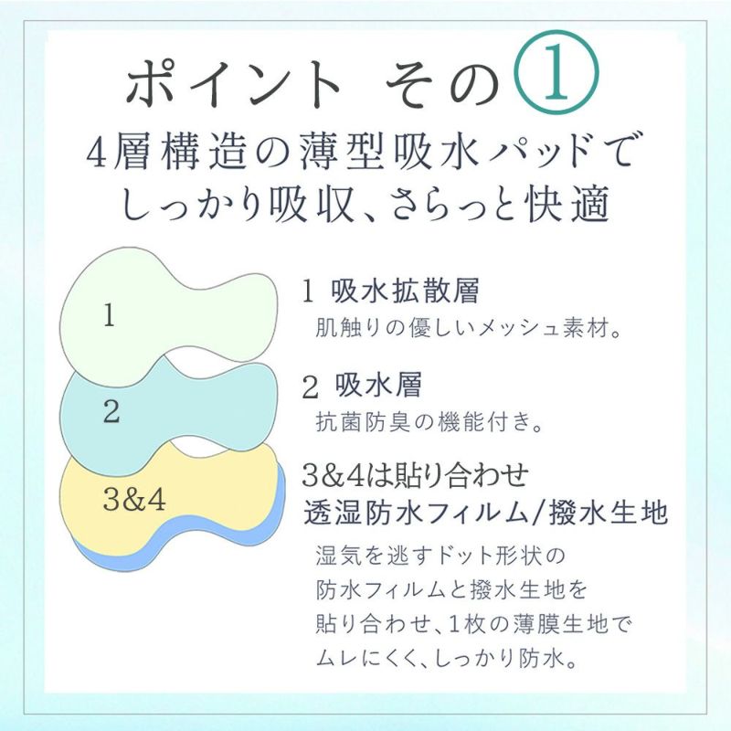吸水パッドは4層構造でしっかり吸水し、サラッと快適。菌の増殖による臭いの発生を防ぐ抗菌防臭の機能付きで、気になる匂いもケアします。吸水パッドの縫製は接着仕様にすることで針穴がなく漏れにくい作りです。厚みは約2.0ミリと薄手で、ごわつきなどの不快感を感じにくくしています。
