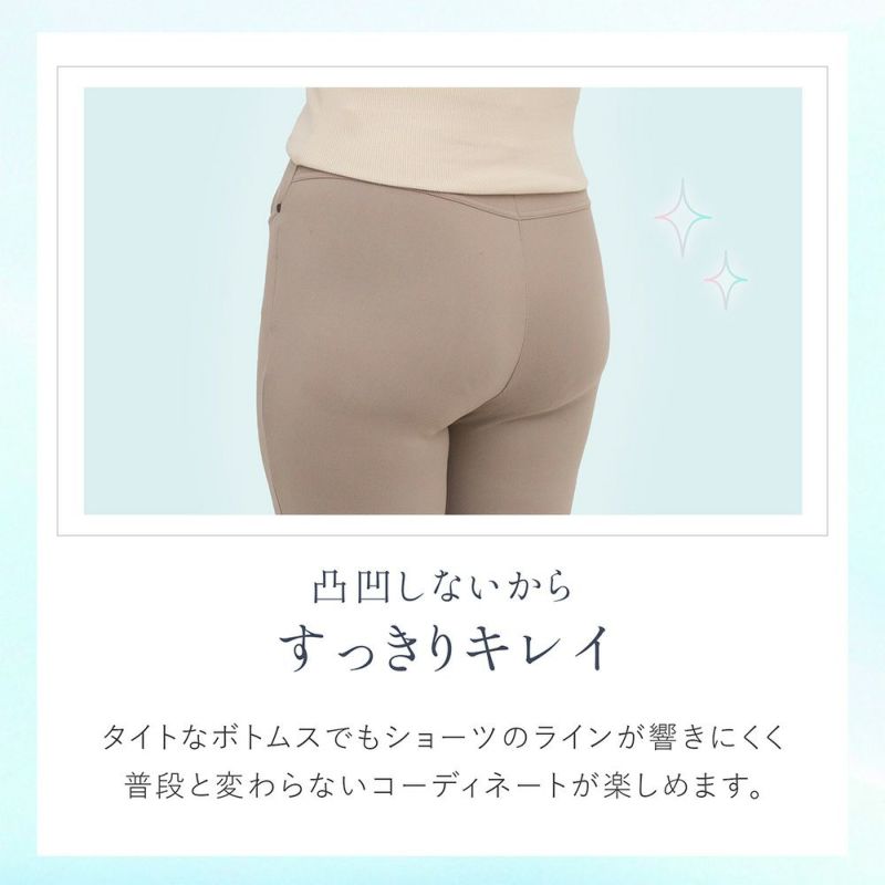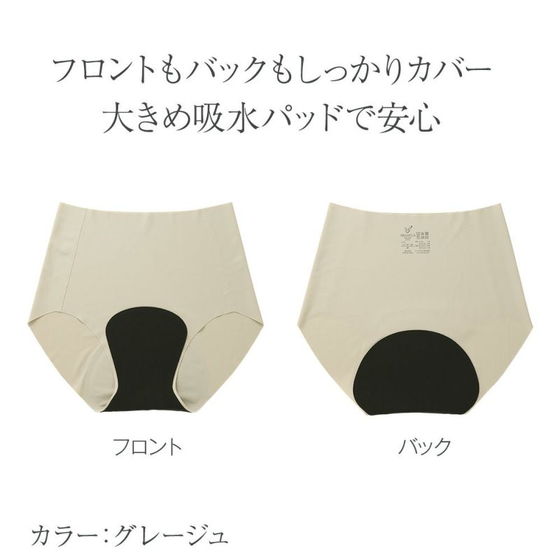 シームレス仕様の吸水ショーツです。深履きタイプでウエストからヒップ下まですっぽりと包み込みます。無縫製の接着仕様で縫い目がないので、フィット感が良く、ボトムスに響きにくくなっています。