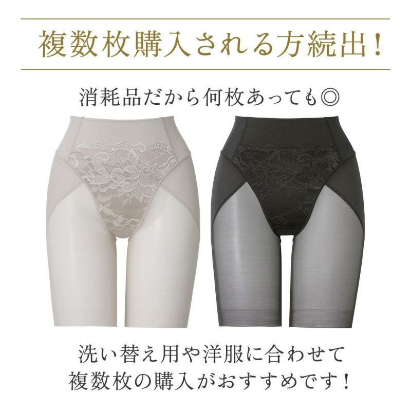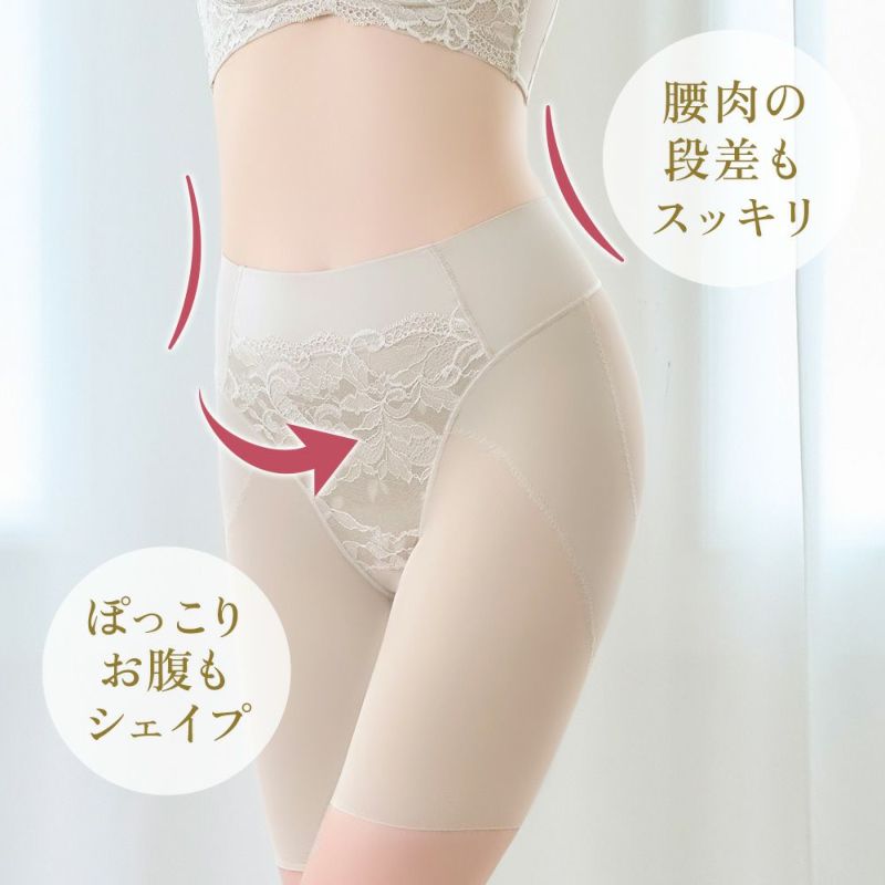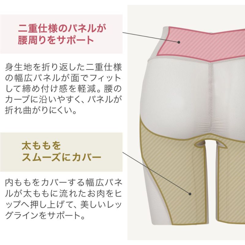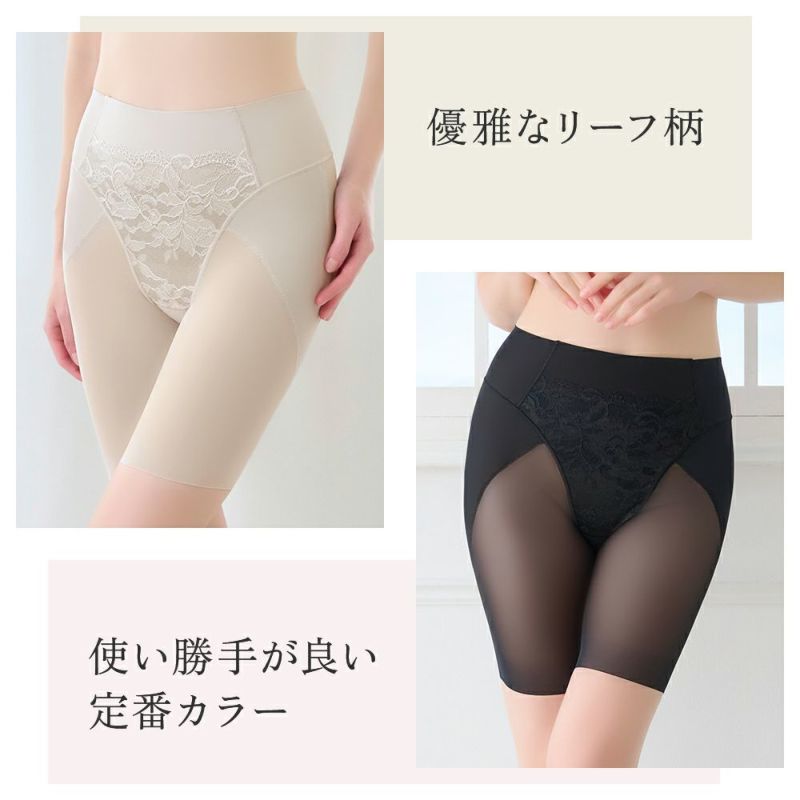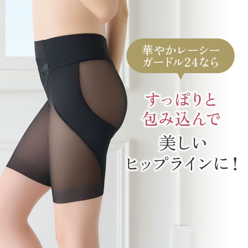 QVC商品名:BRNYピース 華やかレーシーガードル ヒップと太もも全体をすっぽりと包み込み、すっきり整える補整ガードルです。華やかなオリジナルの新柄ストレッチレースを使用し、優雅な色合いが美しいデザイン性の高い人気シリーズです。 ヒップ中心に施したテープはヒップを下から引き上げ、ギャザーが綺麗な丸みををキープします。太ももまで流れたお尻のお肉を包み込み、お尻と太ももの境目を作り、ヒップラインを美しく見せます。また、パワーネットで裏打ちした幅広のヒップアップパネルがヒップと太ももの境界線を作ります。 フロントはレースと身生地の間にパワーネットを内蔵した三重構造でお腹をシェイプします。ウエスト部分は身生地を折り返した二重仕様でテープを使用せず、面でフィットし食い込みにくく楽なはき心地です。 レッグ部分は、補整効果の高いヘムパワーネットを使用しています。伸縮性の高いヘムパワーネットはメッシュ素材で通気性も良く、体の動きにもフィットしやすいです。 足口はフラットなヘム仕様で、食い込みや段差になりにくく、アウターに響きにくくなっています。足口のヘム端はずれ上がりや巻き上がりを軽減します。 クロッチの肌側には肌当たりが優しい綿100%天竺を使用し優しい肌当たりです。消臭機能付きにリニューアルされ、汗の臭いがこもりがちなデリケートゾーンも安心です。また、吸水性・速乾性に優れ、接触冷感機能付きでサラっと快適なはき心地です。