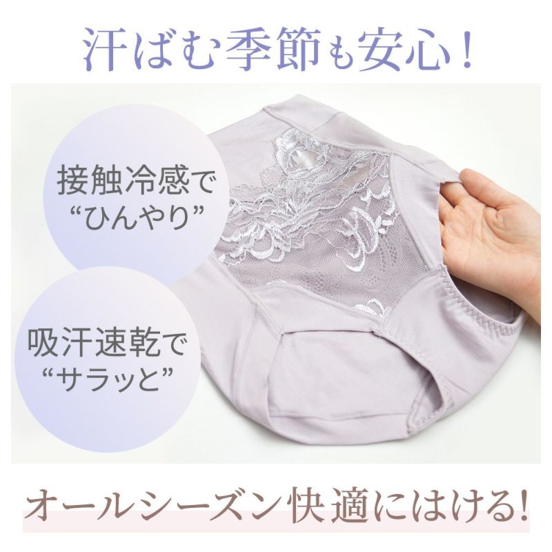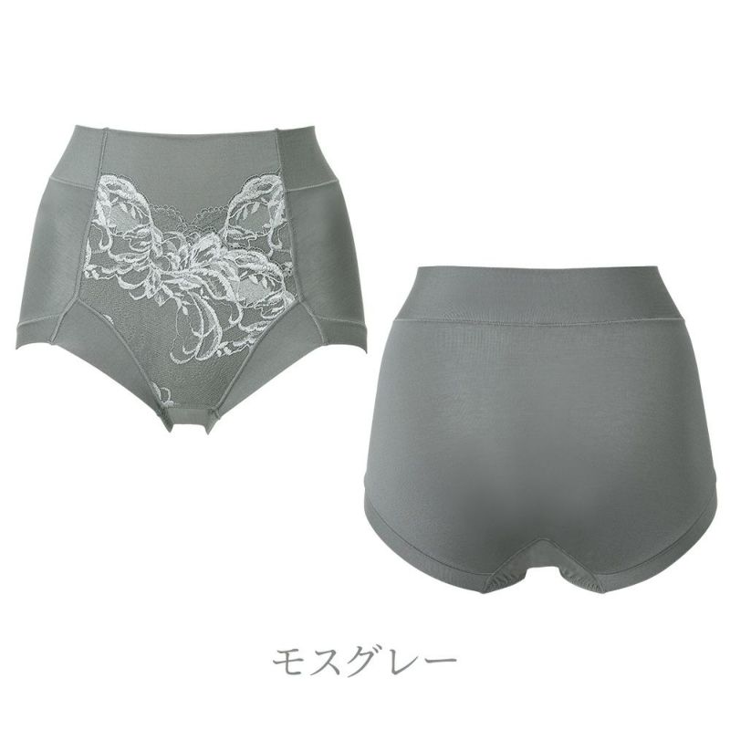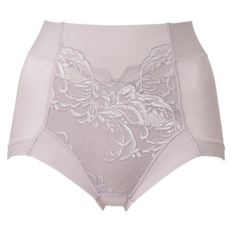 QVC商品名:BRNYピース すらっと細みえ快適ショーツ お腹を広い範囲でカバーし、すらっと細見えするハイウエストの補正ショーツです。 お尻と太ももの境目までしっかりとかぶる立体パターンで、安定感のあるはき心地です。 フロント部分には、ボタニカルガーデンをイメージした落下板ストレッチレースを使用し、エレガントで華やかなデザインです。 お腹部分は、レース・身生地・パワーネットの三重仕様で、適度な締め付け感でお腹を押さえます。ウエスト部分はゴムや切り替えがなく、身生地を折り返した二重仕様で締め付け感を軽減し、食い込みにくく安定したはき心地です。 足口は伸縮性のある身生地を二重に折り返した仕様で、足口をぐるりと包み込み、お尻のお肉がもれないようにサポートします。テープを使用せず面でフィットするので、食い込みにくくソフトな肌当たりです。さらに、そけい部に設置した楽々パネルは伸縮性のある身生地を使用し、足さばきを邪魔することなく窮屈感を軽減します。 身生地は美しい光沢感と優しい肌当たりのナイロン綿ベア天竺素材を使用。繊維が細い最高級ランクの上質な綿糸を使用しており、肌との摩擦が少なく、柔らかくなめらかな着心地です。 伸縮性があるので体の動きに馴染みやすく、窮屈感なく自然で綺麗なヒップラインに整えます。また、接触冷感機能付きで吸汗性・速乾性もあり、汗をかいても快適な着心地です。