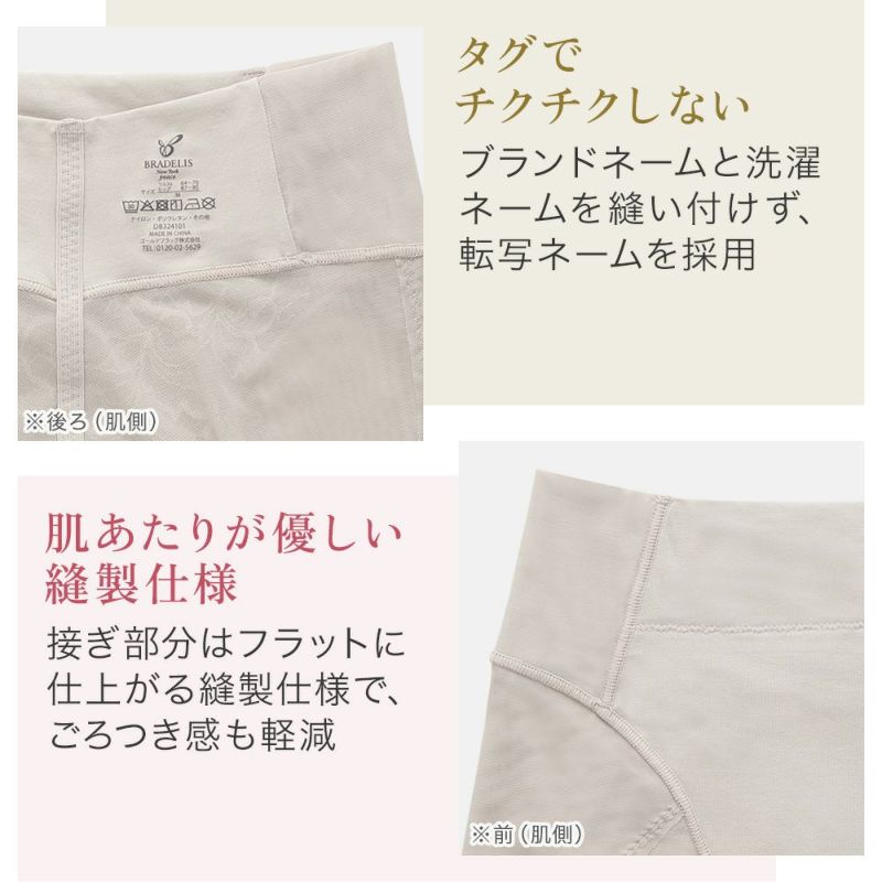 フロントはレースと身生地の間にパワーネットを内蔵した三重構造でお腹をシェイプします。ウエスト部分は身生地を折り返した二重仕様でテープを使用せず、面でフィットし食い込みにくく楽なはき心地です。