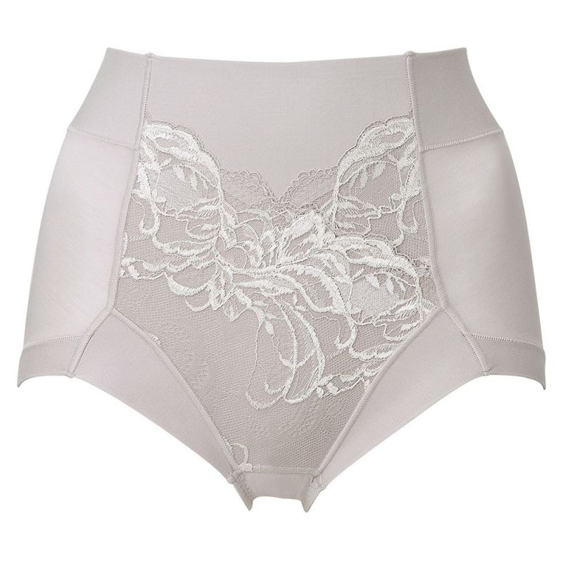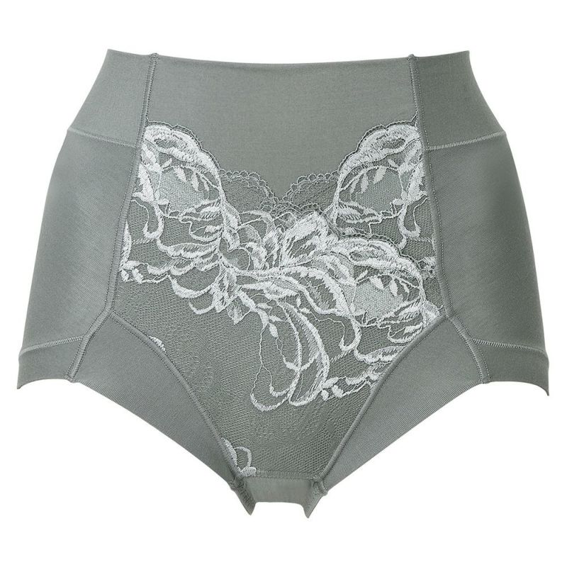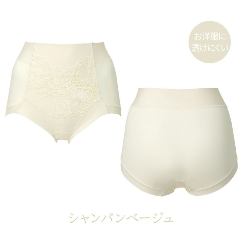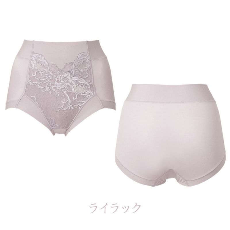 QVC商品名:BRNYピース すらっと細みえ快適ショーツ お腹を広い範囲でカバーし、すらっと細見えするハイウエストの補正ショーツです。 お尻と太ももの境目までしっかりとかぶる立体パターンで、安定感のあるはき心地です。 フロント部分には、ボタニカルガーデンをイメージした落下板ストレッチレースを使用し、エレガントで華やかなデザインです。 お腹部分は、レース・身生地・パワーネットの三重仕様で、適度な締め付け感でお腹を押さえます。ウエスト部分はゴムや切り替えがなく、身生地を折り返した二重仕様で締め付け感を軽減し、食い込みにくく安定したはき心地です。 足口は伸縮性のある身生地を二重に折り返した仕様で、足口をぐるりと包み込み、お尻のお肉がもれないようにサポートします。テープを使用せず面でフィットするので、食い込みにくくソフトな肌当たりです。さらに、そけい部に設置した楽々パネルは伸縮性のある身生地を使用し、足さばきを邪魔することなく窮屈感を軽減します。 身生地は美しい光沢感と優しい肌当たりのナイロン綿ベア天竺素材を使用。繊維が細い最高級ランクの上質な綿糸を使用しており、肌との摩擦が少なく、柔らかくなめらかな着心地です。 伸縮性があるので体の動きに馴染みやすく、窮屈感なく自然で綺麗なヒップラインに整えます。また、接触冷感機能付きで吸汗性・速乾性もあり、汗をかいても快適な着心地です。