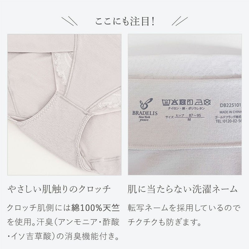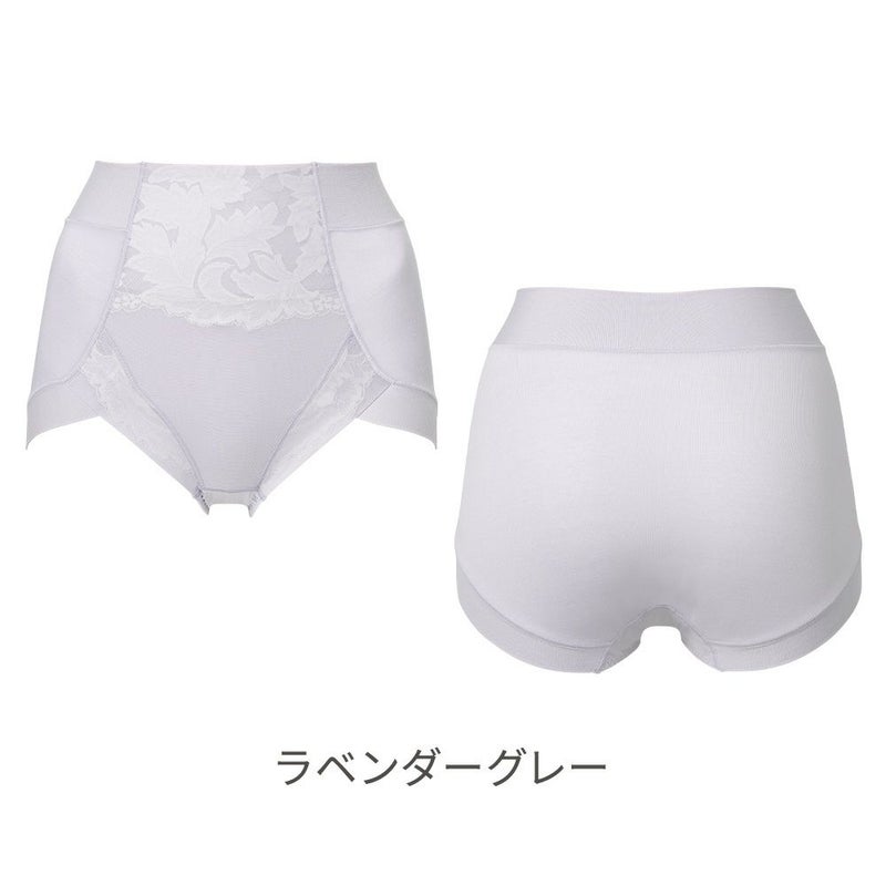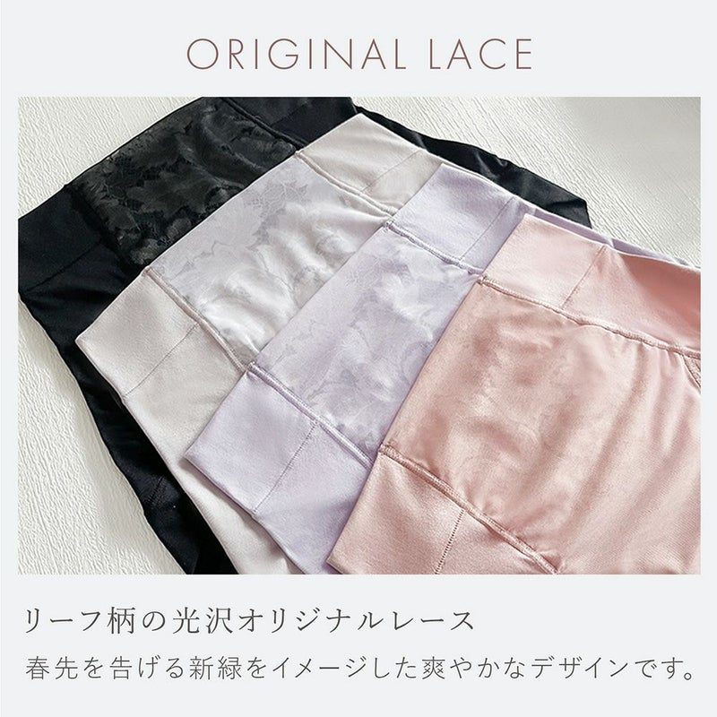 QVC商品名:BRNYピース 綿さらタッチナチュラルフィット綿混ショーツ おへそが隠れるぐらいのはき込み丈で、ウエストからヒップ下まですっぽりと包み込む補正ショーツです。お尻と太ももの境目をしっかり作り、はくだけで美しいヒップラインを作ります。 ヒップは生地一枚仕様にすることで下着のラインが響きにくく、お尻の形に沿った立体パターンでお尻の丸みを潰さず包み込みます。縫製の接ぎ部分は、極力薄く仕上がるフラットな縫製仕様のため優しいはき心地です。 フロント上辺はレース+シアーパワーネットを折り返した三重仕様。下辺は身生地+シアーパワーネットの二重仕様にすることで程良い伸縮性で面でお腹を押さえます。ウエストはゴム不使用で食い込みにくく楽なはき心地です。 身生地は360度によく伸びる優しい肌当たりの綿混素材"ナイロン綿ベア天竺"を使用。柔らかなフィット感で体の動きに馴染みやすく、毛玉になりにくいのも魅力です。また、接触冷感機能に加えて吸汗性と速乾性があるので、汗をかいても快適な着心地をキープします。 足口はそけい部を圧迫しにくいクロス仕様にすることで、可動域が増え圧迫感を軽減しています。クロッチの肌側には優しい肌ざわりで消臭機能付きのナイロン綿ベア天竺を使用しているので、汗の臭いがこもりがちなデリケートゾーンも安心です。洗濯ネームは転写タイプで、お肌が敏感な方でも不快感なく着用していただけます。 フロント上辺とそけい部にリーフ柄の光沢レースをたっぷりあしらい、春先を告げる新緑をイメージした爽やかなデザインです。