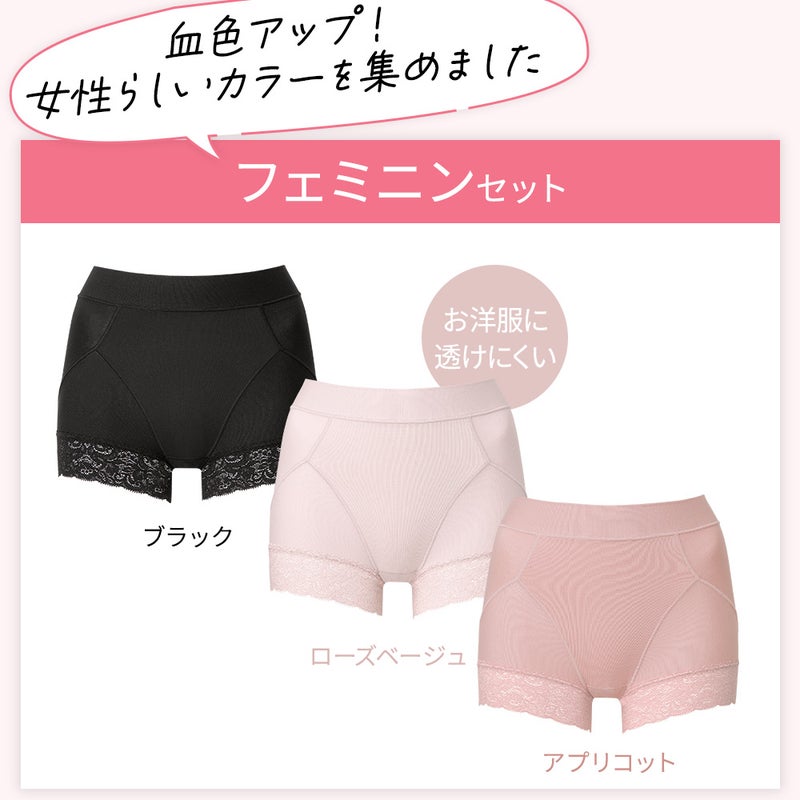 QVC商品名:BRNYピース すっぽり綿混一分丈ショーツ オリジナルの立体パターンでヒップをすっぽりと包み込む、一分丈の補正ショーツ「すっぽりフィット綿混一分丈ショーツ25」の3色セット。 特殊な技術で編立てたオリジナルの裏パイル編みレースが足口にフィットし、ずれ上がりにくさと優しい肌触りを両立。パワーネットを使わず、ナチュラルなヒップメイクが叶います。 ウエスト部分は幅広ウエストベルトで食い込みにくく、折れ曲がりや巻き込みを軽減。お腹押さえパネルがほどよくお腹をシェイプし、面でフィットして締め付け過ぎず楽なはき心地です。 ヒップは立体設計のヒップパターンで、伸縮する身生地がヒップをすっぽり包み込み、丸みのある美しいヒップラインに整えます。後身生地の下部分には「はみ尻ストッパー」を追加し、たるみがちなヒップをすくい上げます。 身生地は、スーピマ綿を使用したナイロン綿ベア天竺素材で、ソフトな風合いでデイリー使いにおすすめ。接触冷感機能に加えて、吸汗性と速乾性もあるので、汗を吸って年中サラっと快適な着心地です。 クロッチの肌側には消臭機能付きの綿100%天竺を使用しているので、汗の臭いがこもりがちなクロッチ部分も安心です。洗濯ネームは転写タイプで、お肌が敏感な方でも不快感なく着用していただけます。 足口のストレッチレースは、お花をモチーフにした高級感漂うデザイン。立体設計の足口パネルで足の動きに合わせてフィットし、そけい部の締め付けを軽減します。