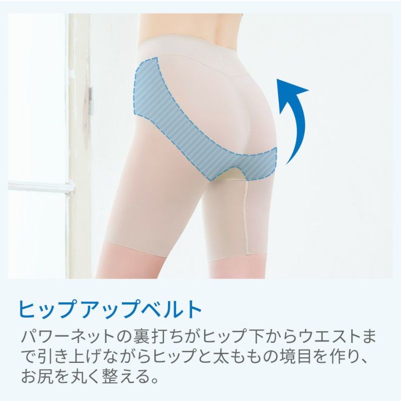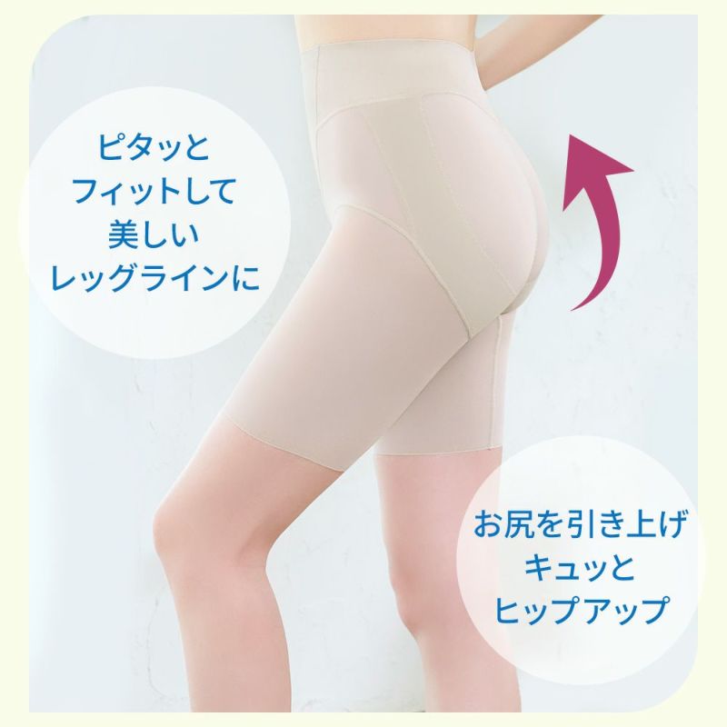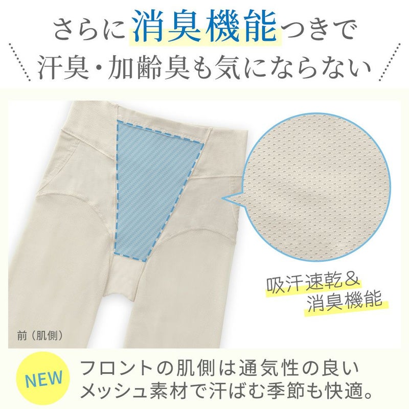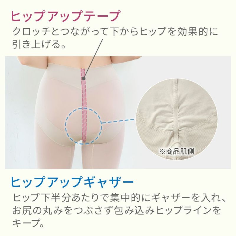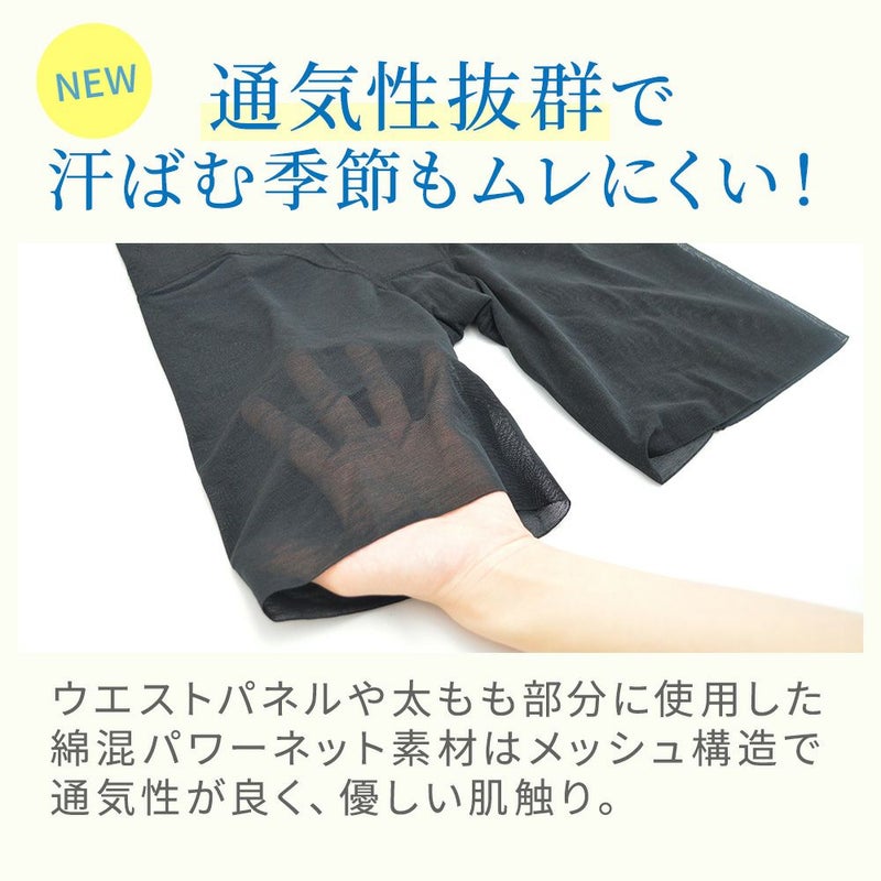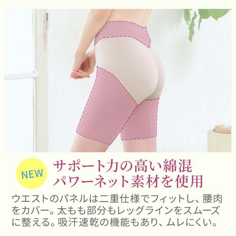 QVC商品名:BRNYピース 綿混楽々スタイリッシュソフトガードル 薄手で柔らかな生地と、ストレスフリーなはき心地が快適な補正ガードルです。 伸縮性のある綿混パワーネット素材とナイロン綿ベア天竺素材を組み合わせることで、締め付け感が少なくヒップまわりをすっきりと整えます。 フロント、ヒップ、クロッチ肌側の素材は、オリジナル開発の薄手で柔らかいナイロン綿ベア天竺素材を使用しています。吸汗性と速乾性に優れ、さらに接触冷感機能がついているので、さらっと快適なはき心地です。また、フロント肌側はメッシュ素材で、汗臭・加齢臭の消臭機能を備えています。 太もも部分は、サポート力の高い綿混パワーネットを使用し、薄手ながらもキックバックがあるので、太ももにピタッとフィットしレッグラインをスムーズに整えます。締め付け過ぎず、心地よい補正力で長時間はいていても心地よい補正力です。さらに、メッシュ構造で通気性が良く太もも周りがむれにくいので、汗ばむ季節も快適にご着用いただけます。 フロント部分は身生地に伸縮性のあるメッシュ素材を裏打ちした二重構造にリニューアルしました。お腹押さえの面積を増やすことで、お腹のシルエットをすっきりと整えます。また、ウエスト部分には綿混パワーネットヘム素材を二重に折り返し、サポート力のある素材が面でフィットして腰肉をカバーします。幅広設計で食い込みや締め付けを軽減します。 ヒップは、下からウエストラインまで引き上げながらサイドをシェイプする一体型パターンで、お尻を持ち上げ丸く整えます。ヒップの下流れを防ぐヒップアップベルトとの相乗効果で、持ち上げたヒップが流れにくい設計です。 クロッチ部分の肌側は、ナイロン綿ベア天竺素材を使用し一枚穿きが可能です。 サポートしたい部分と動きに合わせて伸縮したい部分を使い分けているので、ガードルが苦手な方にもおすすめです。