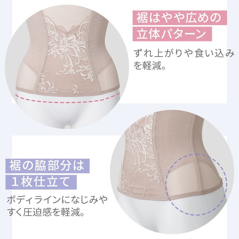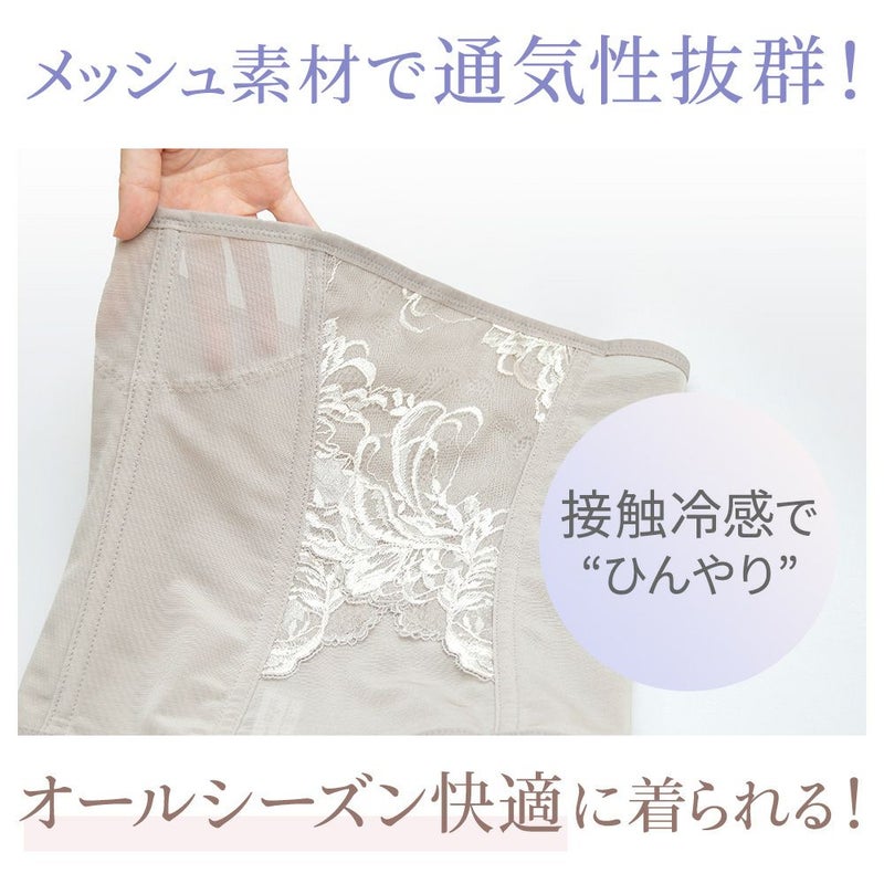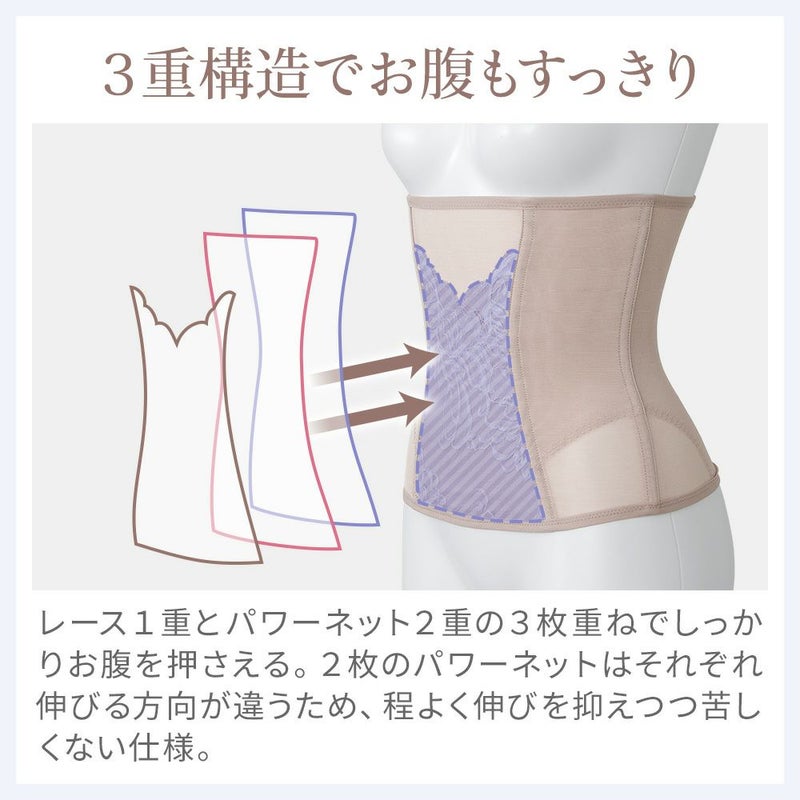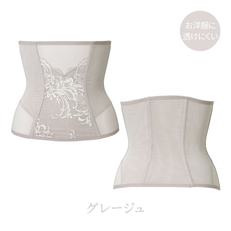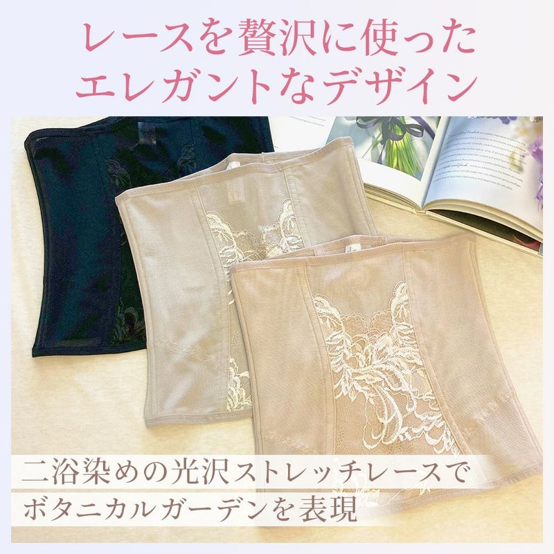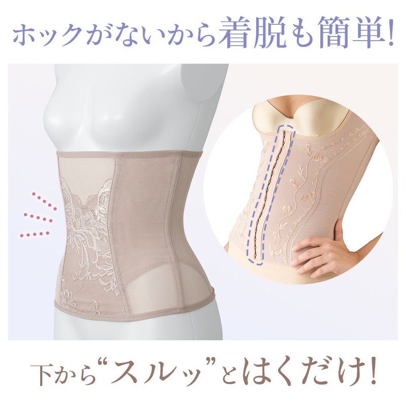 QVC商品名:BRNYピース すらっと細みえウエストニッパー ラクな着け心地でウエストラインをすっきり整える、ウエストニッパーです。 薄手で伸縮性に優れた素材を使用し、ホックが無く着脱がしやすくなっています。 フロントにはボタニカルガーデンをイメージした落下板ストレッチレースを使用し、エレガントで華やかなデザインです。 ウエストのカーブには、フィットしやすい六枚接ぎの立体裁断でくびれをメイク。裾はやや広めの立体パターンでずれ上がりや食い込みを軽減します。サイドとバックに入れた四本のコイルボーンがウエストを支えてくびれをキープしながら、動いた時の身生地のヨレを軽減します。ボーンカバーは肌当たりの良いフレンチパイル素材を使用し、約5mm幅のボーンで安定感があります。 お腹部分はレース一重とパワーネット二重の三枚重ねでお腹を押さえます。二枚のパワーネットは縦伸びと横伸びに分けているので、程よく伸びを抑えつつ苦しくない仕様です。また、みぞおち部分はパワーネット一重で圧迫感を軽減し、ブラのアンダーに当たらないよう前身頃の上辺は横一直線仕様になっています。 脇パーツはパワーネット二枚重ねで、ウエストの段差をなめらかにしてくびれラインを実現。背中はパワーネット二重にすることで面で支え、背骨の両サイドにボーンを一本ずつ設置し、背中をシャキッとさせます。 身生地はハイストレッチパワーのパワーネットを使用し、ウエストを面でしっかりと支えます。 接触冷感機能付きで通気性があるため、快適な着心地でオールシーズン着用可能です。