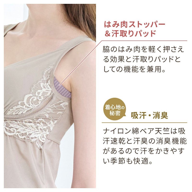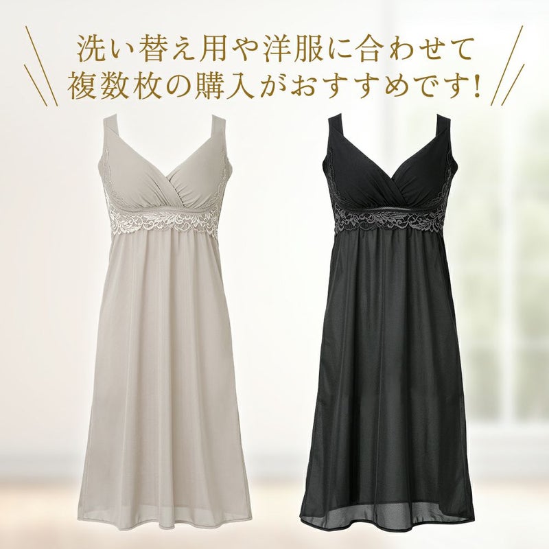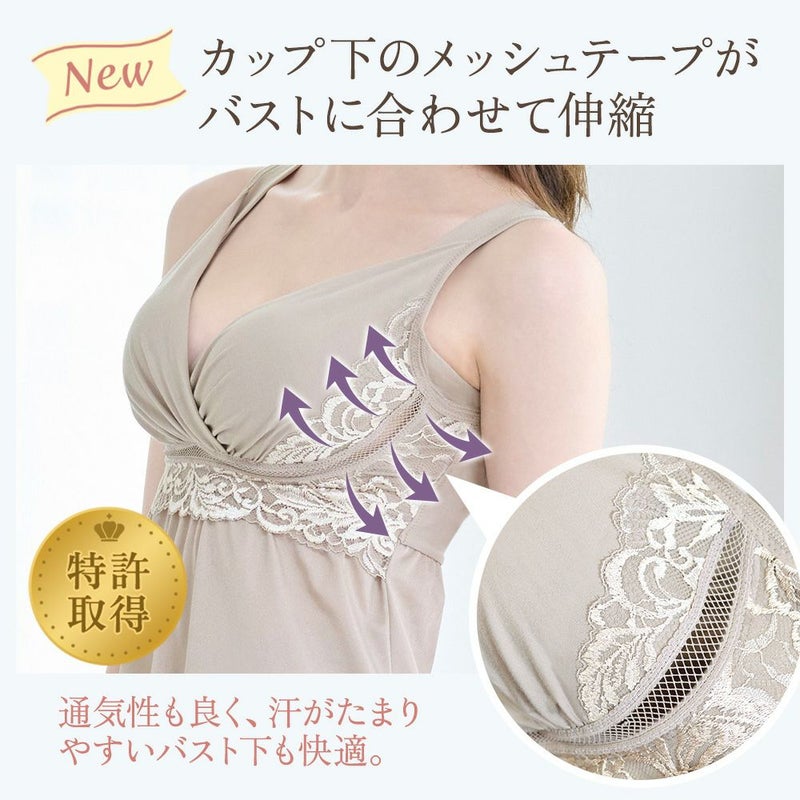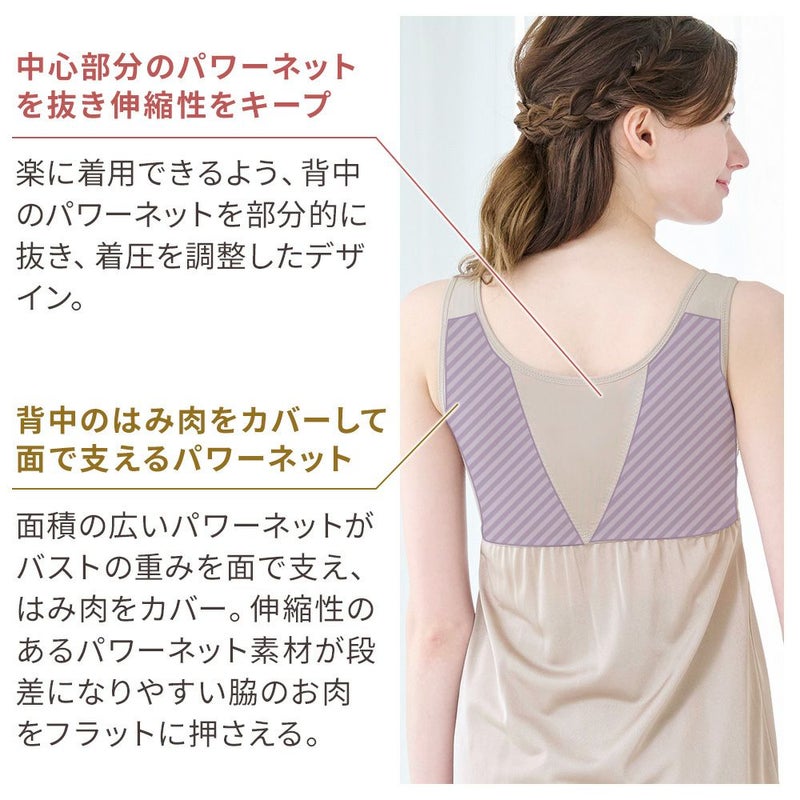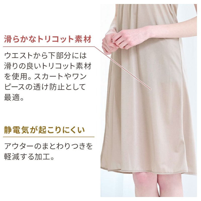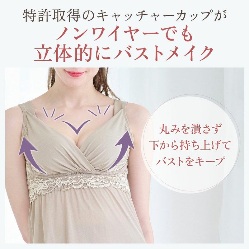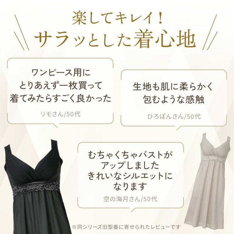 QVC商品名:BRNYピース 綿混キャッチャーカップブラスリップ 美胸シルエットを実現するオリジナルパターンのノンワイヤーブラスリップです。ワイヤーブラのような寄せ上げ効果の高いオリジナルの立体設計ブラパターンを採用し、柔らかなフィット感で、楽な着心地とバストアップ機能を両立します。 バストを立体的に包み込むモールド加工を施した『キャッチャーカップ』は、カップの三本の縦ラインがバストをキャッチして立体的に馴染み、自然で美しいバストラインを作ります。さらにモールドカップ上辺に付けたカーブのハートラインが、バストにあたる食い込みや浮きを軽減します。モールドカップは一体型なので安定感があり、バストをしっかりとホールドします。 身生地は360度によく伸びる優しい肌当たりの綿混素材"ナイロン綿ベア天竺"を使用し、柔らかなフィット感で体の動きに馴染みやすく、毛玉になりにくいのも魅力です。また、接触冷感機能に加えて吸汗性があり、汗臭(アンモニア、酢酸、イソ吉草酸)の消臭機能も備えています。洗濯ネームはカップ内側に縫い付け、直接当たらず優しい肌当たりです。 ウエストから下部分には滑りの良いトリコット素材を使用しました。長めのスカートやワンピースも透けにくいよう、膝まである長めの丈設定に。静電気が起こりにくい加工を施しているので、アウターのまとわりつきを軽減します。 アンダー下で切り替えたパターンで、ゆるやかに自然に広がるAラインシルエットがボディラインを綺麗にカバーします。