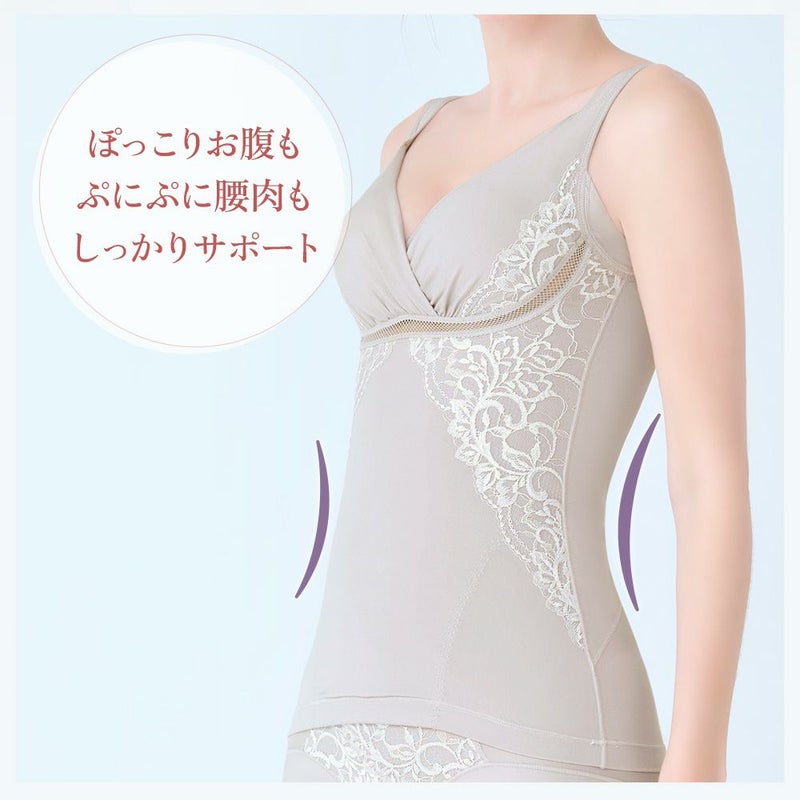 QVC商品名 : BRNYピース 綿混キャッチャーカップレースブラキャミ ノンワイヤーなのに寄せ上げ効果の高い立体設計で、バスト・お腹・背中をソフトに整える綿混素材の補正ブラキャミです。キャッチャーカップ内蔵で楽に美胸を実現し、柔らかなフィット感で楽な着心地とバストアップ機能を両立します。 バストのバージスラインには、メッシュテープを使用したオリジナルパターンを採用し、カップのフィット性を高めると同時にずり上がりを防止。幅方向に伸縮するので、幅広いバストサイズに対応します。また、バージスラインに沿ってバストを包み引き上げる『引き上げループ』は、伸びない素材でバストをしっかりと持ち上げます。起毛素材で優しい肌当たりです。 お腹部分はパワーネットがウエストまでカバーし、広い面積でお腹とウエストをすっきりと整えます。横方向に伸びる仕様で、シェイプ感を保ちながら締め付け過ぎず、快適な着用感です。 背中は変形ボディメイクパネルで、伸縮性のあるパワーネット素材が、段差になりやすい脇と腰のお肉をフラットに押さえます。両サイドの裏打ちパワーネットはウエスト部分の幅を広く取り、広い面で腰肉周りのたるみを抑えスッキリとしたラインを作ります。楽に着用できるよう、背中のパワーネットを部分的に抜き、着圧を調整したデザインです。 身生地は優しい肌あたりのナイロン綿ベア天竺の潤い加工にリニューアル。シアバター、オリーブオイル、シルクアミノ酸、スクワランの4成分とシリコンオイルから成る潤い加工剤で生地をコーティングし、シルキータッチのなめらかさとソフトな柔軟性のある肌触りに。さらに、吸汗性と速乾性があるのでサラっと快適で、毛玉ができにくく、静電気のパチパチ現象が起こりにくいのも魅力です。 カップのサイドと前身頃の両脇に、オリジナルの光沢落下板二浴染めレースを贅沢に使用し、ラグジュアリー感を演出。体のくびれラインに沿った配置で細見え効果もプラスしています。