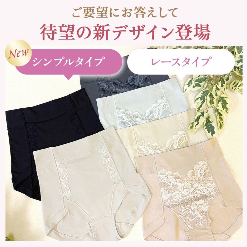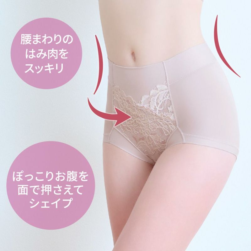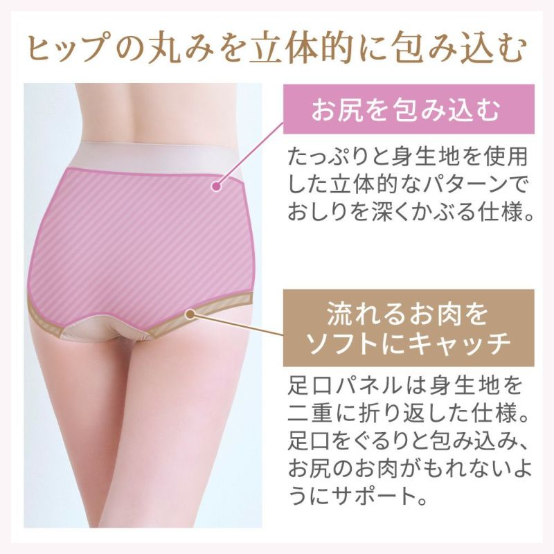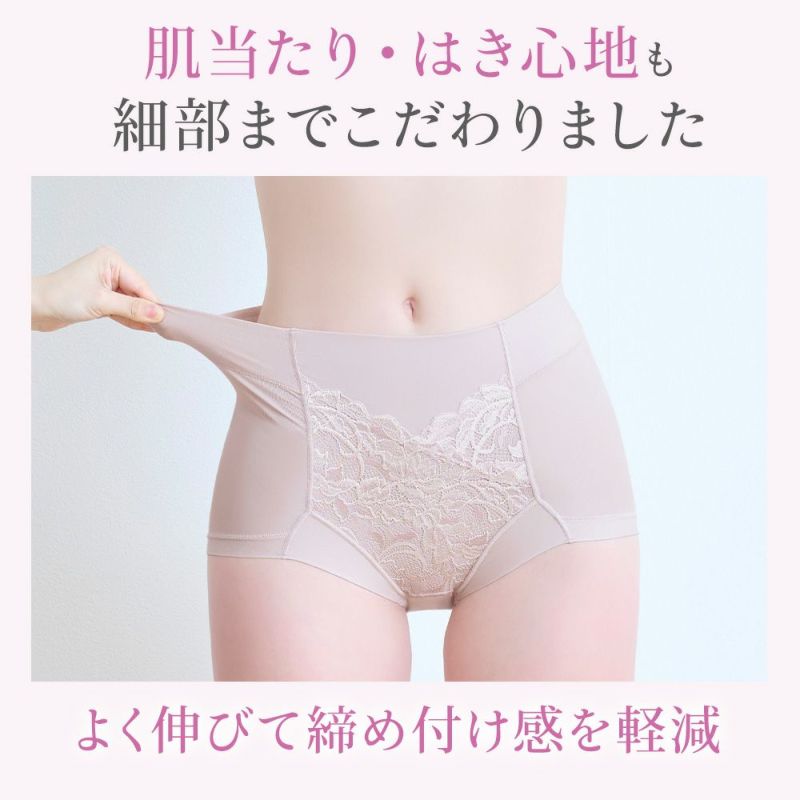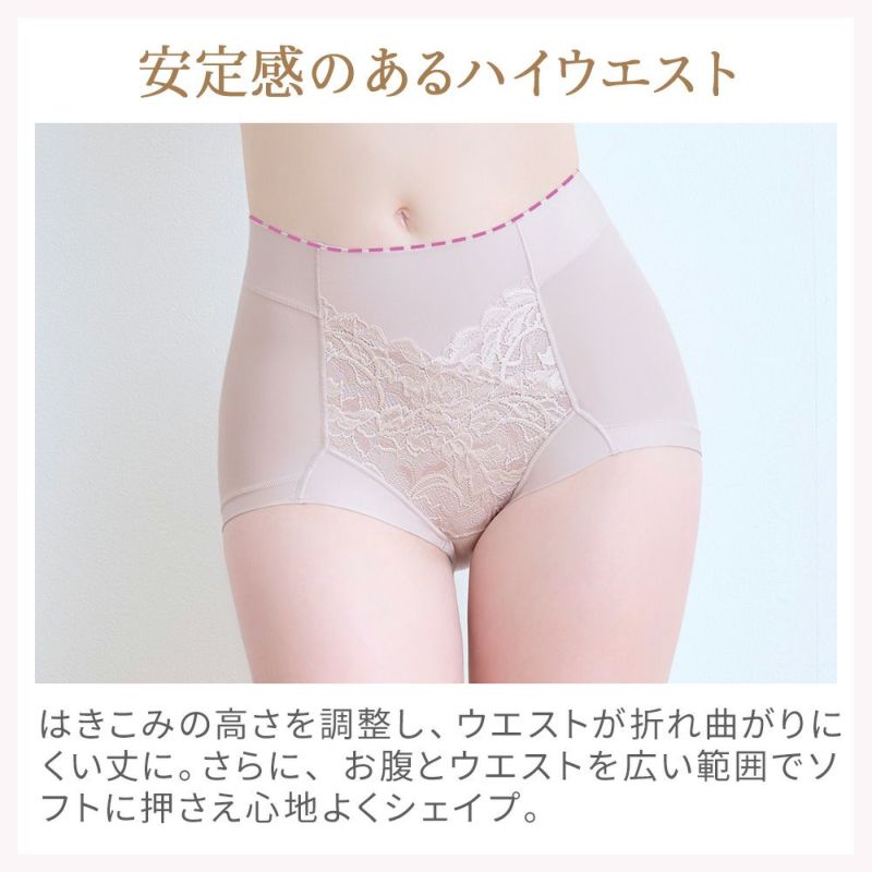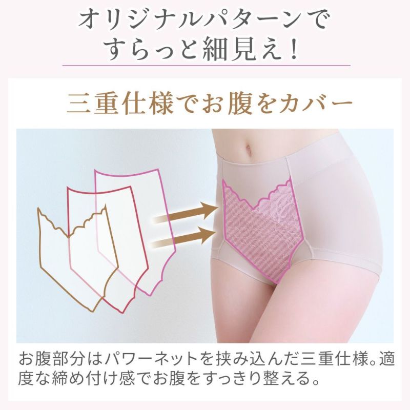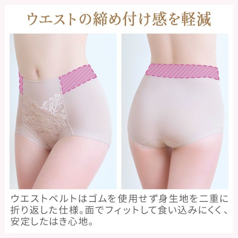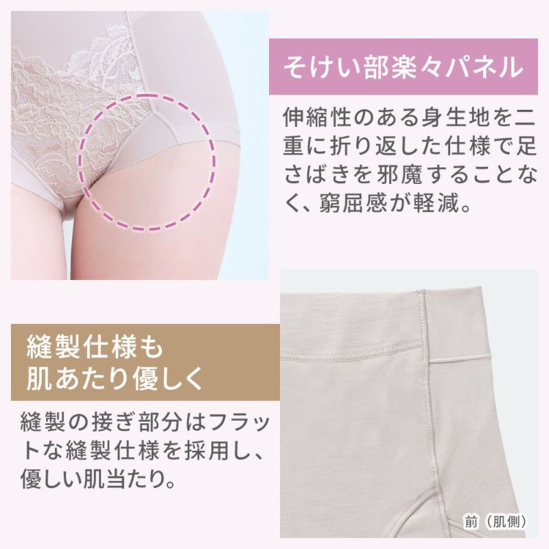 お腹部分は三枚重ねのお腹押さえ仕様でパワーネットを挟み込み、適度な締め付け感で幅広くお腹を押さえます。ウエスト部分はゴムや切り替えがなく、身生地を折り返した二重仕様で苦しくなく、前身頃のウエストからお腹部分の肌側にかけて、接ぎのない一枚仕立てで優しい肌当たりです。
