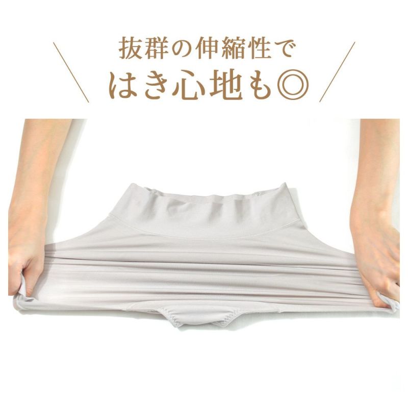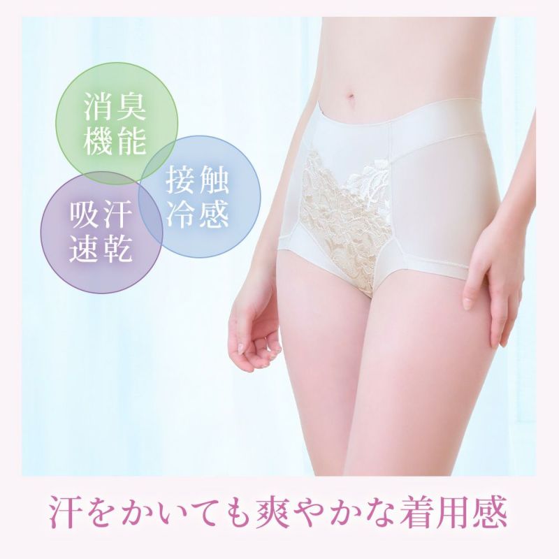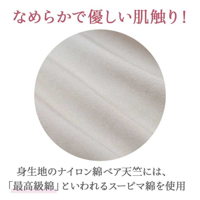 身生地は、美しい光沢感と優しい肌あたりのナイロン綿ベア天竺素材を使用。ナイロン綿ベア天竺には接触冷感機能や、吸汗性と速乾性もあるので汗ばむ季節も快適です。さらにクロッチの肌側には汗臭(アンモニア、酢酸、イソ吉草酸)の消臭機能を備えています。