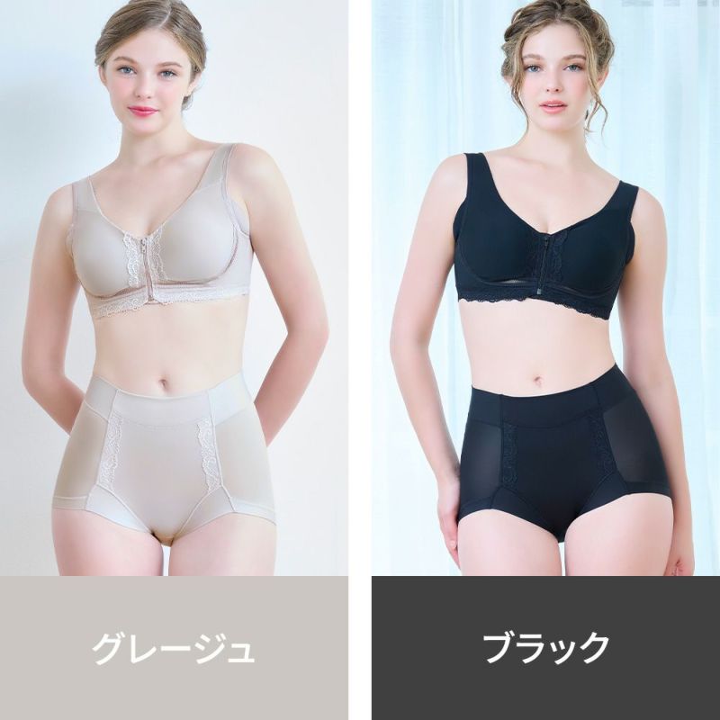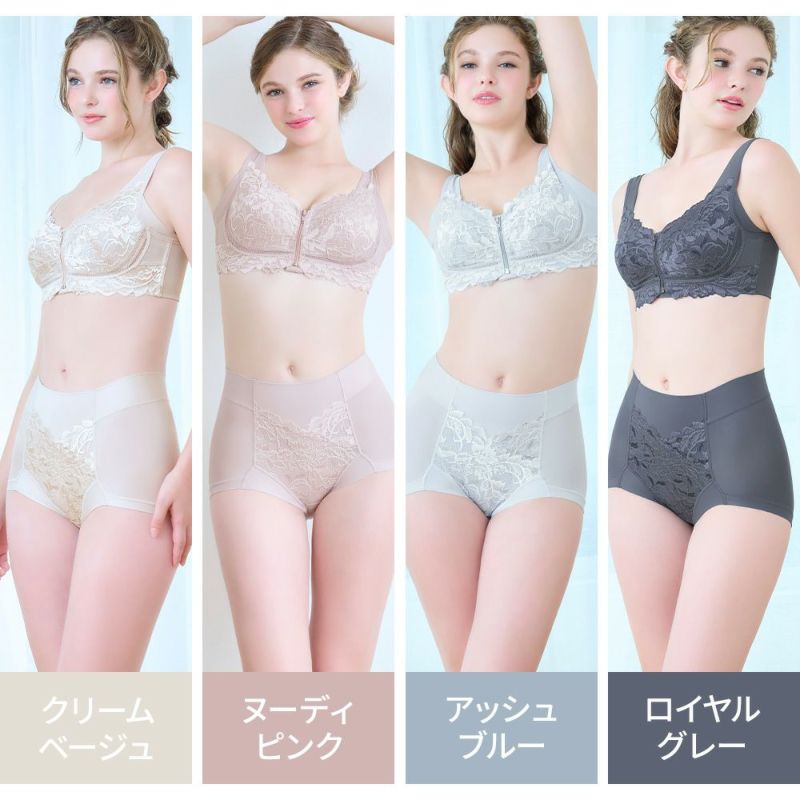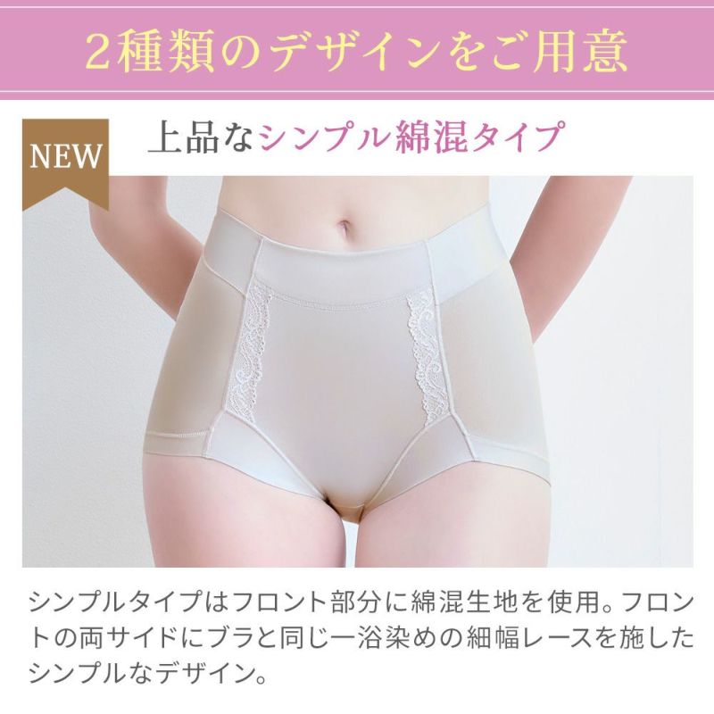 デザインはフロントレースとシンプル綿混の2タイプのデザインをご用意。フロントレースタイプは、フロント一面に広幅レースを使用したゴージャスなデザイン。シンプル綿混生地タイプは、フロントの両サイドに細幅レースを施したシンプルなデザインです。