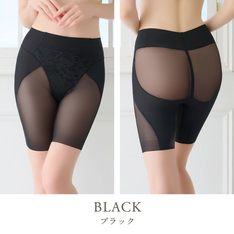 ヒップ中心に施したテープはヒップを下から引き上げ、ギャザーが綺麗な丸みををキープします。太ももまで流れたお尻のお肉を包み込み、お尻と太ももの境目を作り、ヒップラインを美しく見せます。また、パワーネットで裏打ちした幅広のヒップアップパネルがヒップと太ももの境界線を作ります。