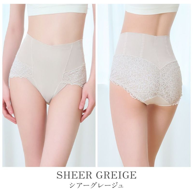 ヒップ部分はゴージャスな総レース仕様のヒップアップパネルを使用し、レースにパワーネットを裏打ちした幅広パネルが下からヒップをすくい上げ効果的にヒップアップします。さらに、バックセンターのヒップアップテープがクロッチから引き上げてヒップアップ機能をサポートし、ヒップ下部分の立体ギャザーがヒップを包み込み、丸みのある美しいシルエットをキープします。