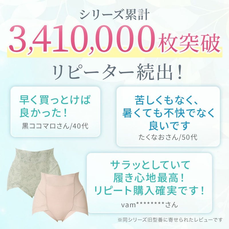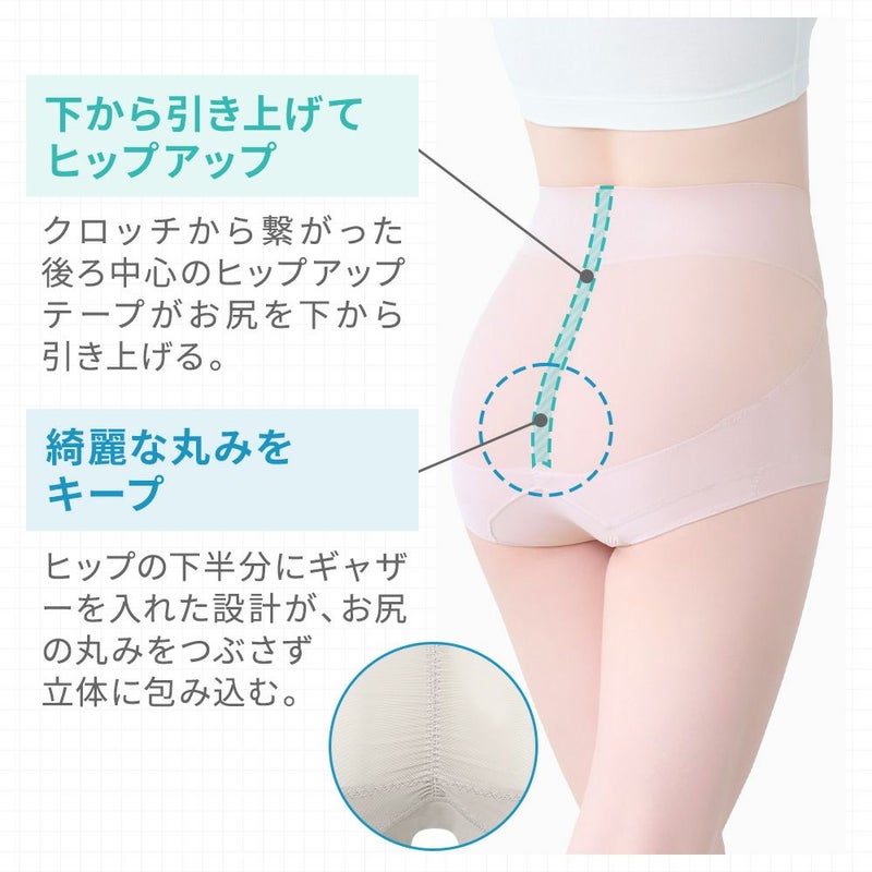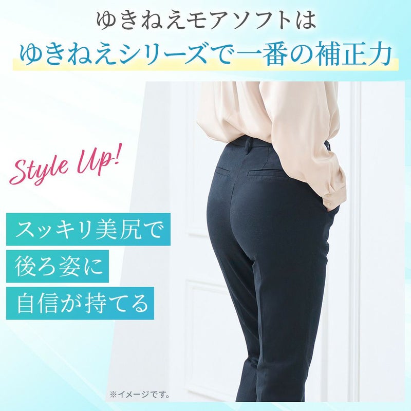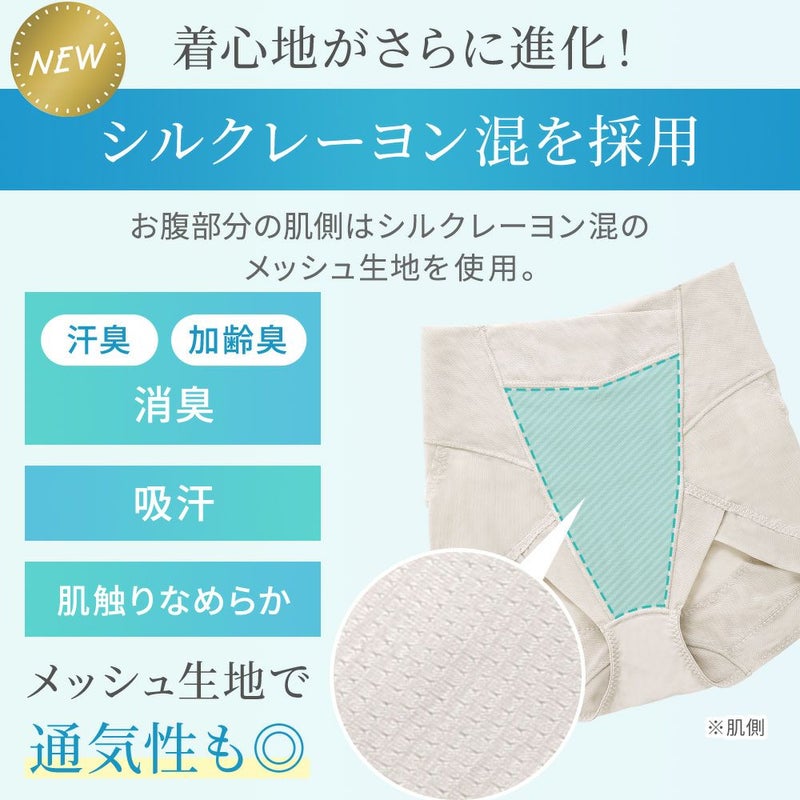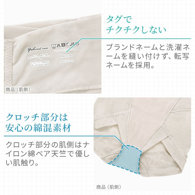 QVC商品名 : ゆきねえモアソフト快適ショーツ 大人気の補正下着ブランド「Yukine inc.」のロングセラー、モアソフト快適シリーズ。ウエストからヒップ全体をソフトな伸縮性のパワーネット素材ですっぽり包み込み、おへそが隠れるハイウエスト丈で安定感のあるはき心地の補正ショーツです。 お腹部分はパワーネットとシルクレーヨン混メッシュ生地を使った二重構造で押さえ、お腹を面でカバーしてすっきりシェイプします。前ウエストはパワーネット素材を折り返した二重のクロスパネル仕様となり、ウエストのサイズ変化に合わせて伸縮するので、圧迫感を感じにくく優しい肌当たりです。 ヒップは裏打ちした二重構造のヒップアップベルトが太ももの付け根からお尻をすくい上げ、下へ流れたお尻のお肉を引き上げます。パネルはフロントへ繋がり、フロントと引き合う事でヒップアップ&お腹シェイプ機能の相乗効果が期待できます。 身生地にはオリジナルのパワーネットを使用し、締め付けすぎず心地よくフィットします。肌触りが優しく伸縮性があり、さらには通気性のあるメッシュ素材なので乾きやすく、接触冷感機能も備えています。また、シルクレーヨン混メッシュ生地は吸汗性(吸水性)に優れ、汗臭・加齢臭の原因臭気に対する消臭性も備えており、オールシーズン快適な着心地です。