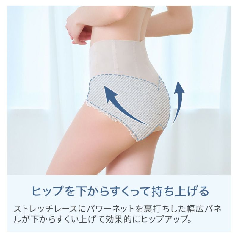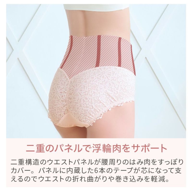 お腹部分はパワーネットを折り返しクロスに重ねた四重構造のカシュクール仕様で、四枚のパワーネットがお腹をおさえ滑らかにシェイプします。上辺のクロス部分はお腹のサイズに合わせて可動するので締め付けず、ウエスト上辺にはテープを使用していないので食い込みにくく楽な履き心地です。ウエストパネルには6本のテープを内蔵し、腰周りのはみ肉をおさえてすっきりと整えます。芯になって腰周りを支えるので、ウエストの折れ曲がりや巻き込みを軽減し、美姿勢をサポートします。