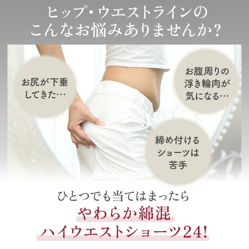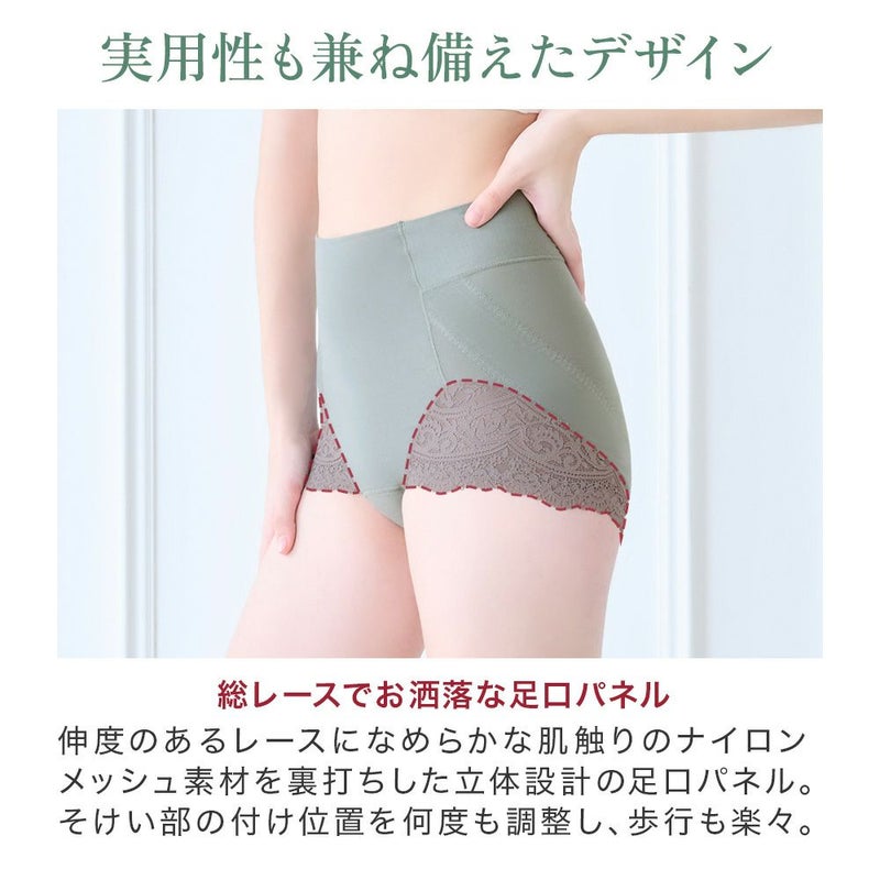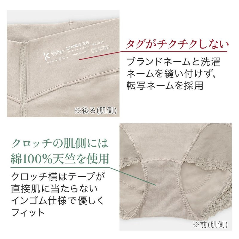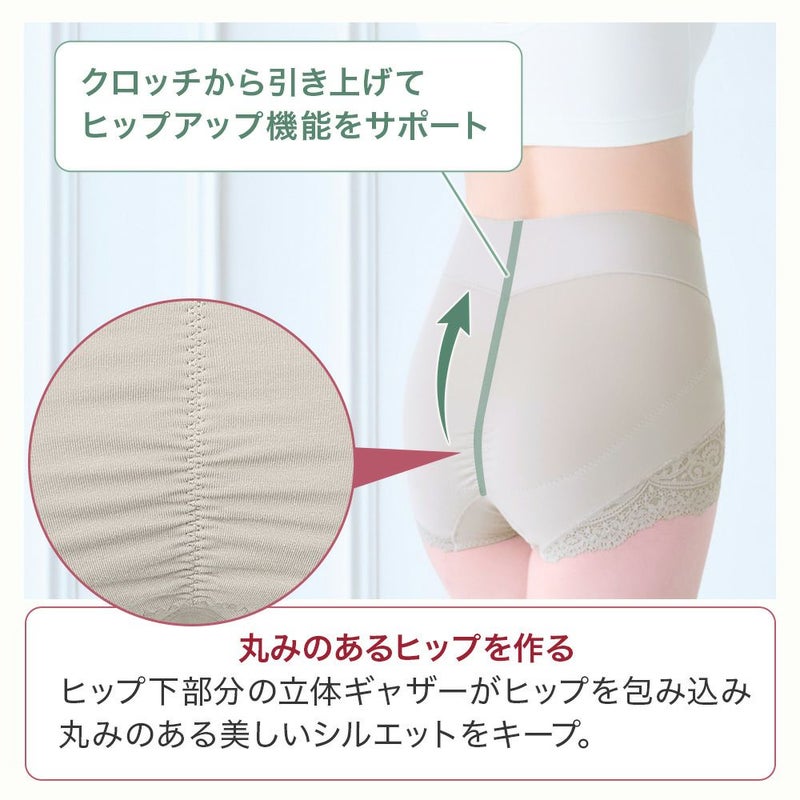 QVC商品名:カヤビューティラボ やわらか綿混ハイウエストショーツ ウエストまですっぽりと包み込むオリジナルパターンの一分丈ショーツです。ソフトな風合いのストレッチレースをたっぷりと使用し、アウターのあたりが少ないシンプルでスタイリッシュなデザインです。 ヒップ下からフロントまで続くナイロンメッシュ素材のヒップアップパネルが、ヒップを下からすくってもち上げます。さらにヒップ下の立体ギャザーがヒップを包み込み、センターにあるヒップアップテープがクロッチから引き上げて丸みのある美しいシルエットをキープします。 フロント部分は身生地にナイロンメッシュを挟み込んだ三重構造でお腹押さえをサポートします。ハイウエスト設計で腰周りのはみ肉(浮輪肉)をすっぽりと包み込んでカバーします。ウエストパネルは折れ曲がりや巻き込みを軽減する幅広設計で、食い込みにくくなめらかなはき心地です。 身生地には、ポリウレタンに「ライクラ(R)ファイバー」を使用したオリジナル開発の綿混素材を使用し、ほどよい肉厚感とフワッとやわらかな肌触りでオールシーズン快適な着心地です。 立体設計の足口パネルにはキックバックの良いナイロンメッシュを裏打ちし、伸度のある総レースでお洒落なデザインです。そけい部の締め付けを軽減し、歩行もラクにできるオリジナル設計になっています。