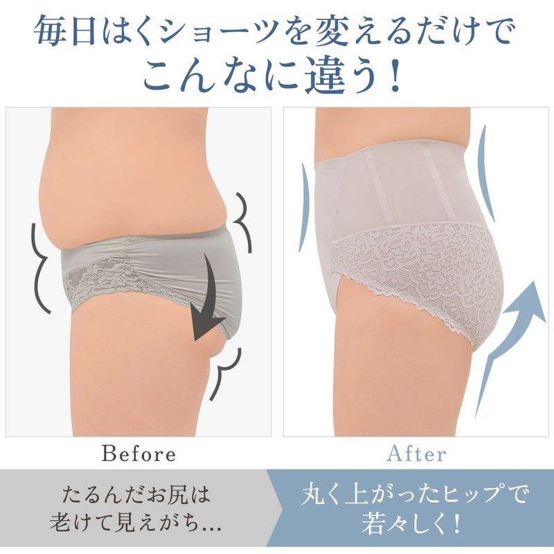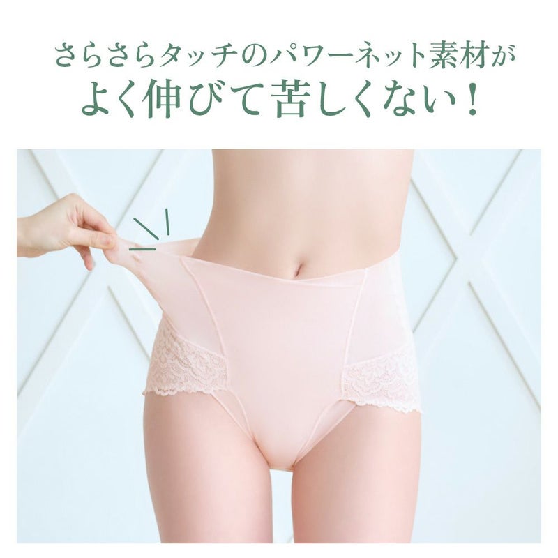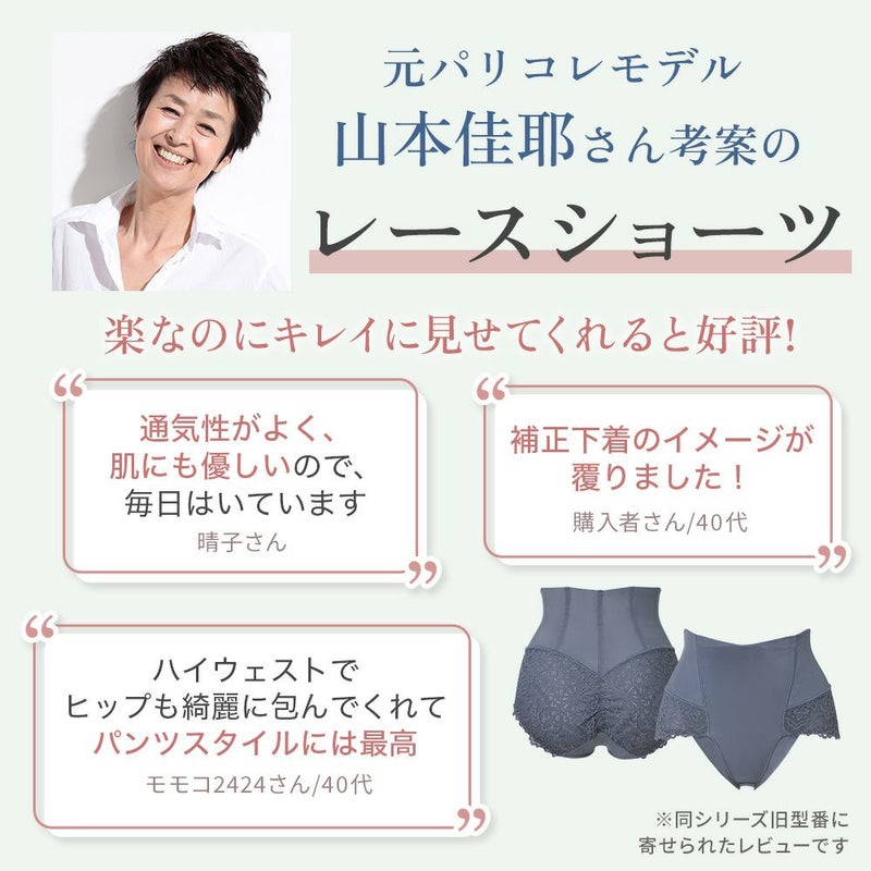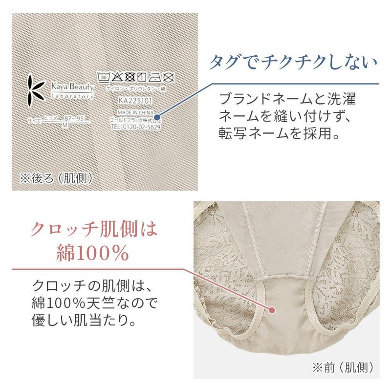 QVC商品名:カヤビューティラボ ハイウエストレーシーショーツ ウエストまですっぽり包み込む「カヤビューティラボ」のハイウエスト補正ショーツです。サポート力のある素材でフィット感が高く、オリジナルのクロスシェイプパターンでお腹周りをすっきりシェイプします。 ヒップ部分はゴージャスな総レース仕様のヒップアップパネルを使用し、レースにパワーネットを裏打ちした幅広パネルが下からヒップをすくい上げ効果的にヒップアップします。さらに、バックセンターのヒップアップテープがクロッチから引き上げてヒップアップ機能をサポートし、ヒップ下部分の立体ギャザーがヒップを包み込み、丸みのある美しいシルエットをキープします。 お腹部分はパワーネットを折り返しクロスに重ねた四重構造のカシュクール仕様で、四枚のパワーネットがお腹をおさえ滑らかにシェイプします。上辺のクロス部分はお腹のサイズに合わせて可動するので締め付けず、ウエスト上辺にはテープを使用していないので食い込みにくく楽な履き心地です。ウエストパネルには6本のテープを内蔵し、腰周りのはみ肉をおさえてすっきりと整えます。芯になって腰周りを支えるので、ウエストの折れ曲がりや巻き込みを軽減し、美姿勢をサポートします。 足口は深めのクロス設計により可動域が広く、圧迫感を感じにくくなっています。カッティングを深めにしたことでさらに食い込みを軽減し、楽な履き心地になりました。 身生地はソフトでさらさらタッチのパワーネット素材を使用し、伸縮性があり締め付け過ぎずお腹やヒップを補整します。メッシュ組織で通気性があり、さらに接触冷感機能もあるのでオールシーズン快適です。 クロッチ肌側は綿100%天竺を使用し、洗濯ネームは縫い付けず転写ネームを採用しています。ネームタグが無いので肌当たりが優しくすっきりとしたはき心地です。