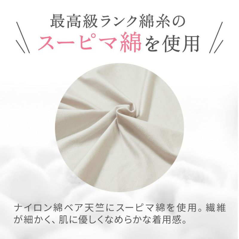 身生地のナイロン綿ベア天竺の綿にはスーピマ綿を使用し、柔らかく滑らかで優しい着心地です。さらに接触冷感機能で肌に触れた瞬間“ひんやり”。吸汗性と速乾性に優れているので、汗を吸って夏でもサラっと快適です。