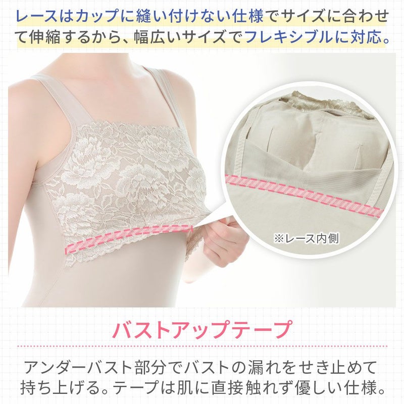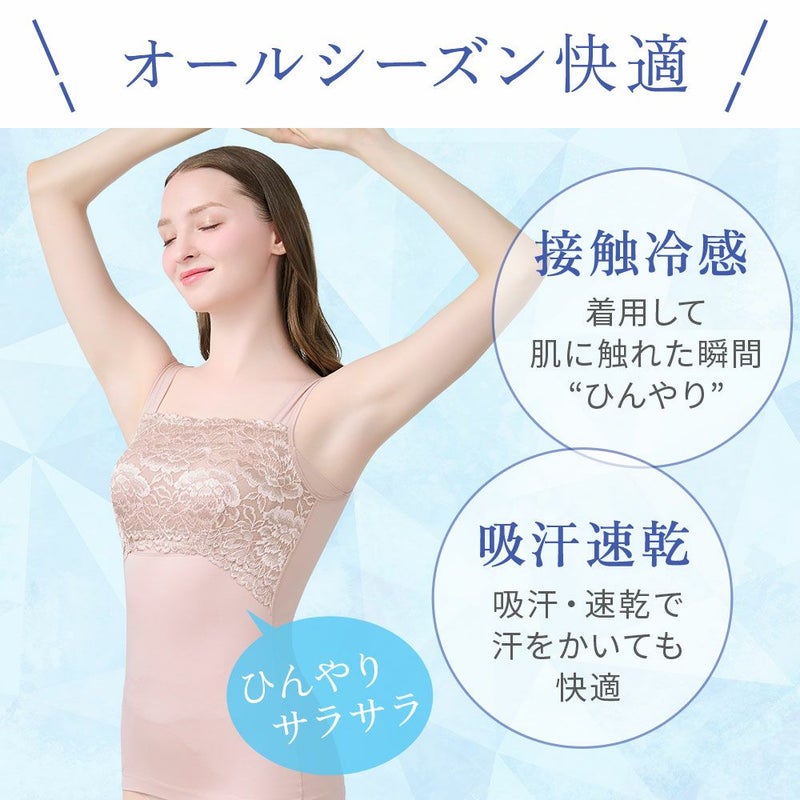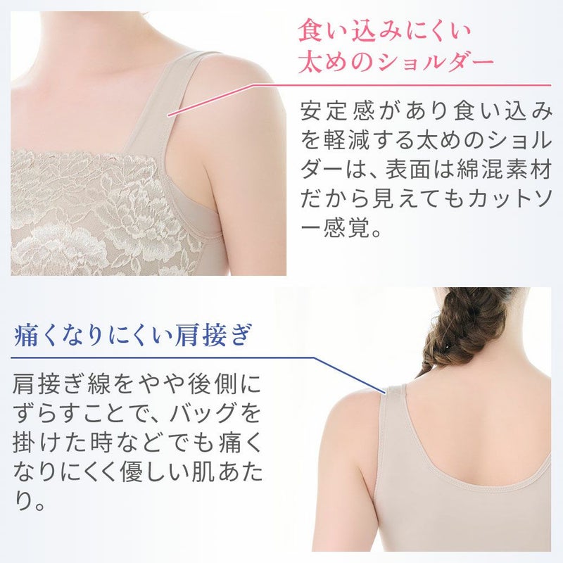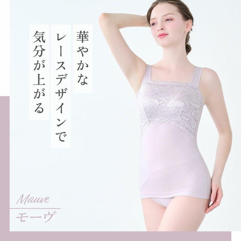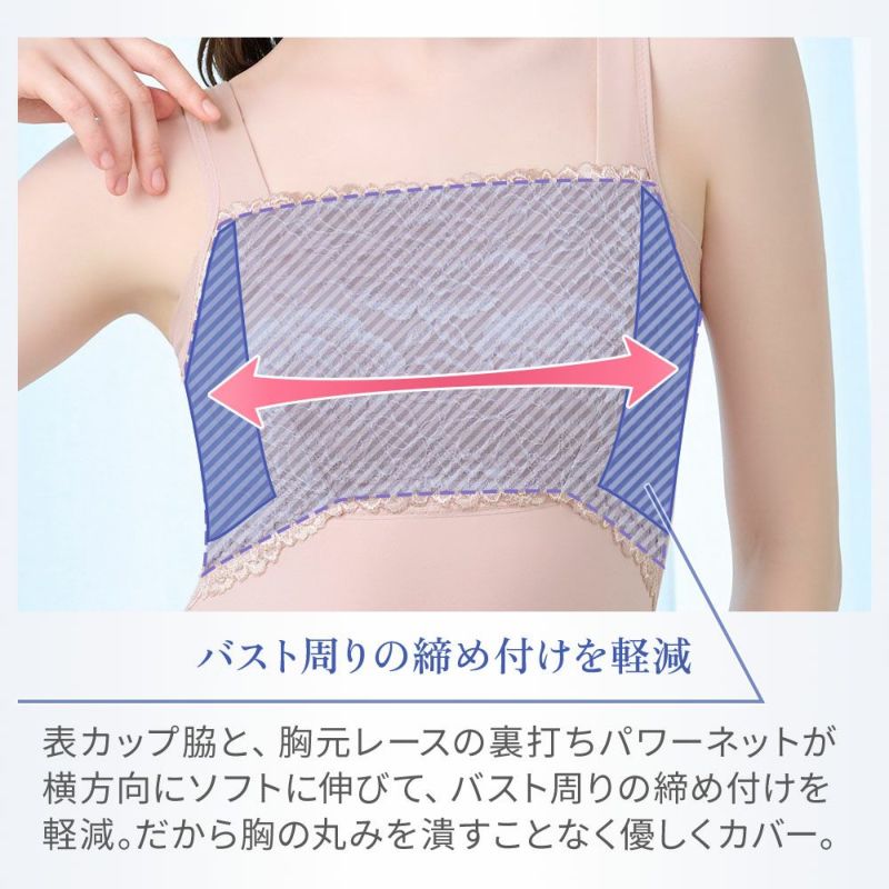 QVC商品名:BRNYピース ハッピーバストアップレーシーブラキャミソール 柔らかな着心地でバストラインを美しく整える補正ブラキャミです。 胸元には光沢落下板ストレッチレースを使用し、人気商品「おしりPラインヒップラップショーツ25」と同じピオニー柄のデザインになります。 特許取得の立体バストアップパターンを採用し、バストの丸みを潰さず、柔らかなフィット感で美しいバストシルエットを演出します。 カップ上部には薄手で伸縮性のあるモビロンテープを挿入し、食い込みにくく胸元に優しくフィットするため谷間のチラ見えを防止します。 カップ脇の「サイドプッシュパネル」には、バストをサイドから中心に寄せる効果があり、ソフトに伸びるパワーネットがカップ横の窮屈感を軽減します。 表カップ下側の「盛り上げパワーネット」で下垂を防止し、カップ肌側両脇の「引き上げサイドパネル」がバストをキャッチして脇流れを防止します。 身生地のナイロン綿ベア天竺の綿にはスーピマ綿を使用し、柔らかく滑らかで優しい着心地です。 さらに接触冷感機能で肌に触れた瞬間“ひんやり”。吸汗性と速乾性に優れているので、汗を吸って夏でもサラっと快適です。 インナーを感じさせない高級感が魅力のデザインと実用性を兼ね備え、気になるボディラインを美しくスムーズに整えます。