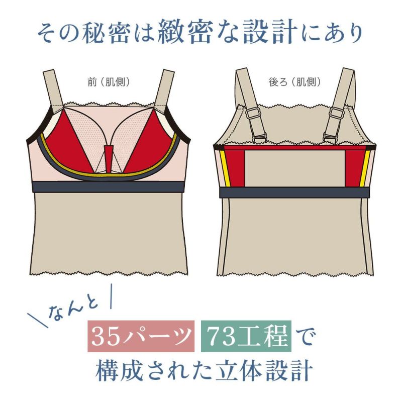 カップにはアウターに響きにくいオリジナルのモールドカップを使用し、柔らかなウレタン素材で軽い着け心地です。斜め下からバストを支えるカップ内側の「立体プッシュアップパネル」がバストを引き上げ、テンションを入れたパワーネット素材のパネルがワイヤー役をしてカップを立体的にキープします。