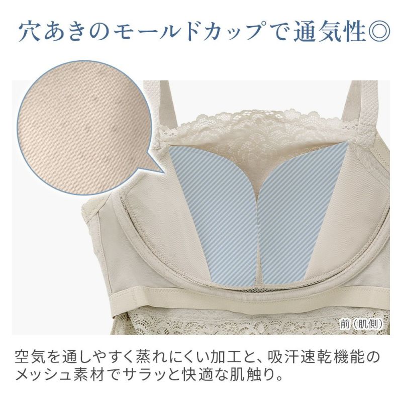 肩紐は食い込みにくい幅広のアジャスター仕様で、体型やお好みのバスト位置に合わせて長さ調整が可能です。肌側は薄手で柔らかな起毛素材で凹凸を付けた変化編地にリニューアルされ、ずり落ちを軽減します。