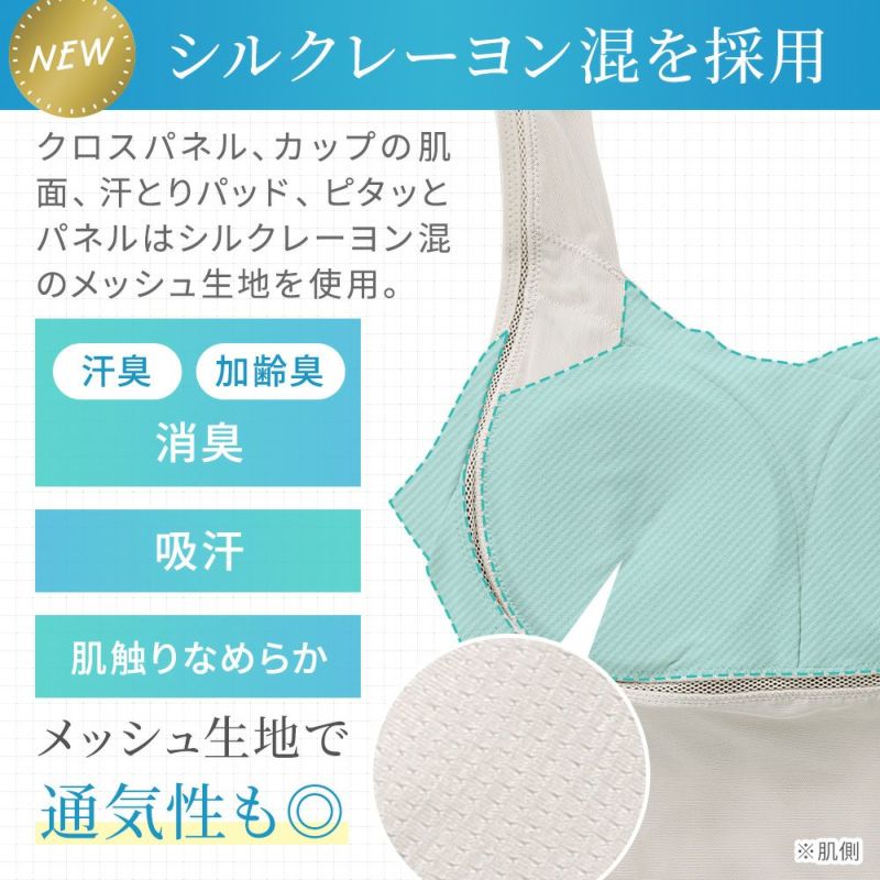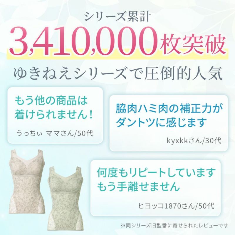 QVC商品名:ゆきねえモアソフト快適フルカップシェイプブラキャミ 大人気の補正下着ブランド「Yukine inc.」のロングセラー、モアソフト快適シリーズ。伸縮性のあるパワーネットが、楽な着心地でボディラインを美しく整える補正ブラキャミです。 ワイヤー代わりのバストアップメッシュテープがバストをしっかりと引き上げ、下垂気味のバストをリフトアップします。メッシュテープは伸縮性が高く、カップのフィット性を高めると同時にずれ上がりを防止し、幅広いバストサイズに対応します。また、サイドにあるプッシュパネルがカップの横広がりを押さえてすっきり細見えに。幅広パネルが面で支えて脇をすっきりと整えます。カップ脇にはシルクレーヨン混のメッシュ素材を使用し汗もしっかりと吸収しさらっと快適です。 身生地のパワーネットはメッシュ素材のため、通気性に優れ汗ばむ季節も快適です。さらに接触冷感機能がパワーアップし、吸汗性、消臭性、速乾性も兼ね備えてるので、暑い季節に嬉しい機能がたくさんつまっています。カップは、安定感のあるフルカップデザインでバスト全体をしっかり包み込みます。取り外し可能なパッドは通気性のある穴あきパッドで、ムレにくくなっています。 フロント部分はソフトに伸縮するパワーネットを裏打ちした二重構造で、気になるお腹をほどよく押さえます。背中は広い面で押さえることで段差なくすっきりとした綺麗なボディラインに整えます。