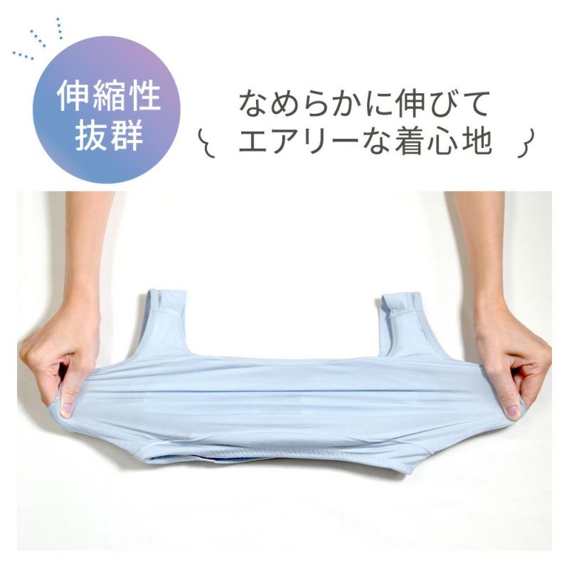 表と肌に触れる部分は、ソフトに伸び、柔らかく体を包み込むシルクレーヨン混ベア天竺生地を使用。天然繊維であるシルクは糸が細くなめらかな肌触りです。