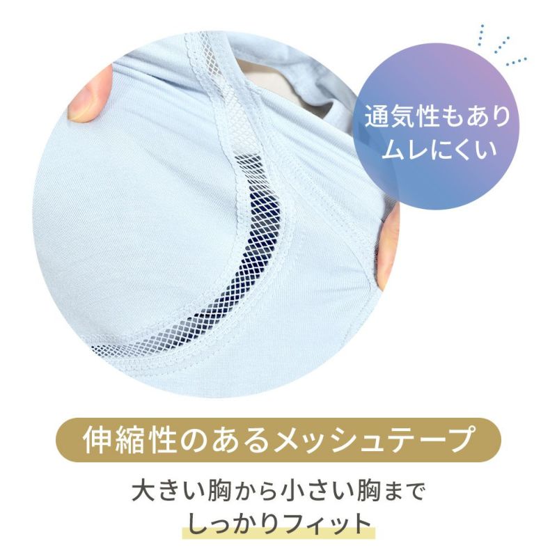 安定感のあるフルカップ仕様で、ブラ前中心が深くバストがしっかりカップ内に収まります。伸縮性があり、様々なバストサイズに対応できます。サイズに合わせた通気性の良い穴あきパッドがついており、取り外しも可能です。