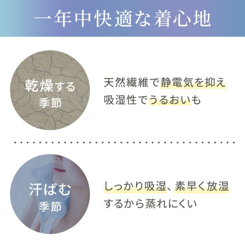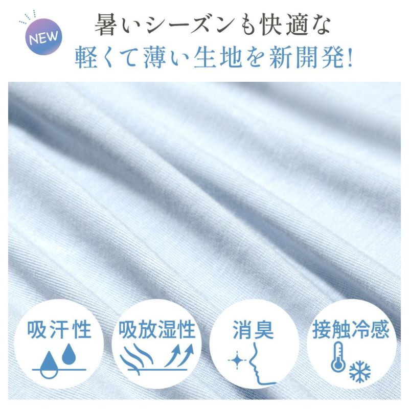 さらに、吸湿性・吸水性・放湿性に優れ、接触冷感機能も備えているので、蒸れなどの不快感を軽減しオールシーズン快適な着心地です。