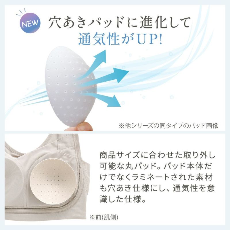 安定感のあるフルカップ仕様で、ブラ前中心が深くバストがしっかりカップ内に収まります。伸縮性があり、様々なバストサイズに対応できます。サイズに合わせた通気性の良い穴あきパッドがついており、取り外しも可能です。