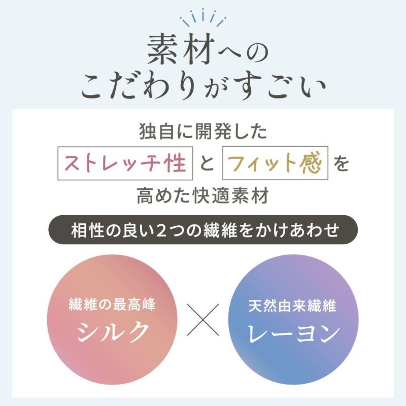 表と肌に触れる部分は、ソフトに伸び、柔らかく体を包み込むシルクレーヨン混ベア天竺生地を使用。天然繊維であるシルクは糸が細くなめらかな肌触りです。