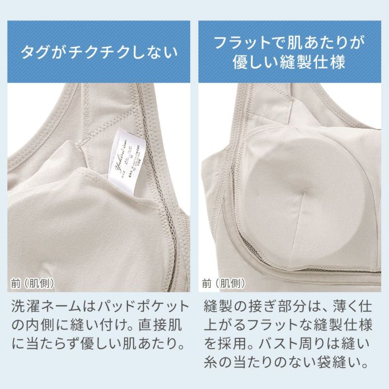 フラットな縫製仕様になっており、ステッチは表側にすることで肌面に縫い糸はなく、優しい肌当たりです。肩接ぎ線をショルダーポイントからやや後側にずらした設計のため、バッグを掛けて肩に負荷がかかっても痛くなりにくいです。