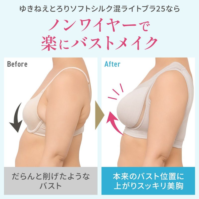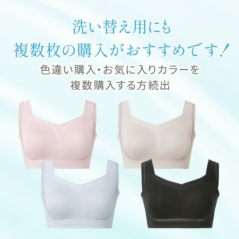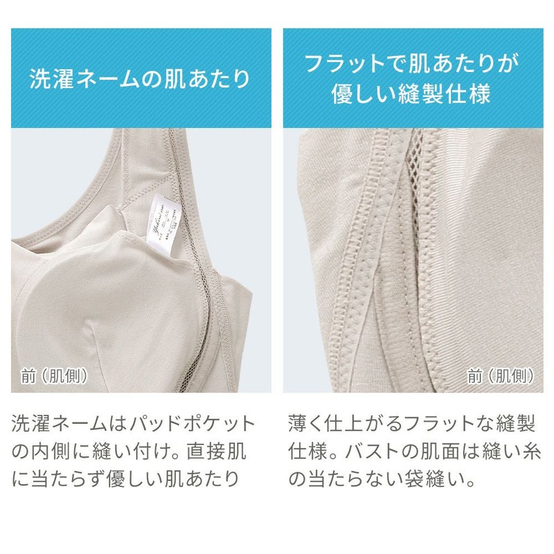 QVC商品名:ゆきねえ とろける肌触りソフトシルク混ライトブラ 大人気の補正下着ブランド「Yukine inc.」から、暑い時季に適した薄手で涼しい補正ノンワイヤーブラが登場。後ろが空いた洋服でも背中部分が薄手で丈は短めのため目立ちにくく夏にぴったりです。締め付けにくいパターンでなめらかな肌触りがバストを優しく包み込みます。 安定感のあるフルカップ仕様で、ブラ前中心が深くバストがしっかりカップ内に収まります。伸縮性があり、様々なバストサイズに対応できます。サイズに合わせた通気性の良い穴あきパッドがついており、取り外しも可能です。 表と肌に触れる部分は、ソフトに伸び、柔らかく体を包み込むシルクレーヨン混ベア天竺生地を使用。天然繊維であるシルクは糸が細くなめらかな肌触りです。 さらに、吸湿性・吸水性・放湿性に優れ、接触冷感機能も備えているので、蒸れなどの不快感を軽減しオールシーズン快適な着心地です。 フラットな縫製仕様になっており、ステッチは表側にすることで肌面に縫い糸はなく、優しい肌当たりです。肩接ぎ線をショルダーポイントからやや後側にずらした設計のため、バッグを掛けて肩に負荷がかかっても痛くなりにくいです。 着ていることを忘れるような快適さを実現した補正ブラ。日中はボディメイクの補整ブラとして 夜はバストケア用として、ご希望に合わせた使用ができます。