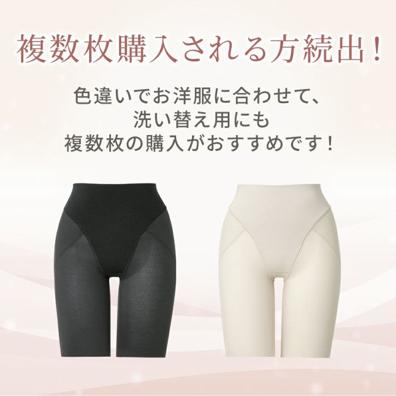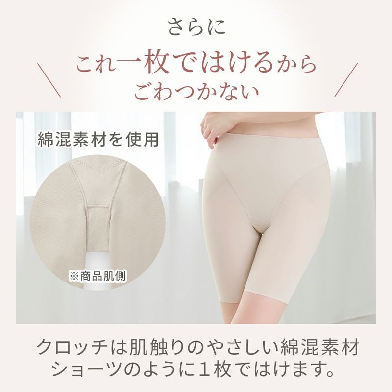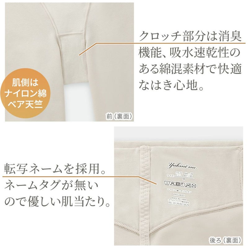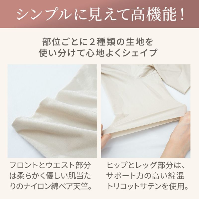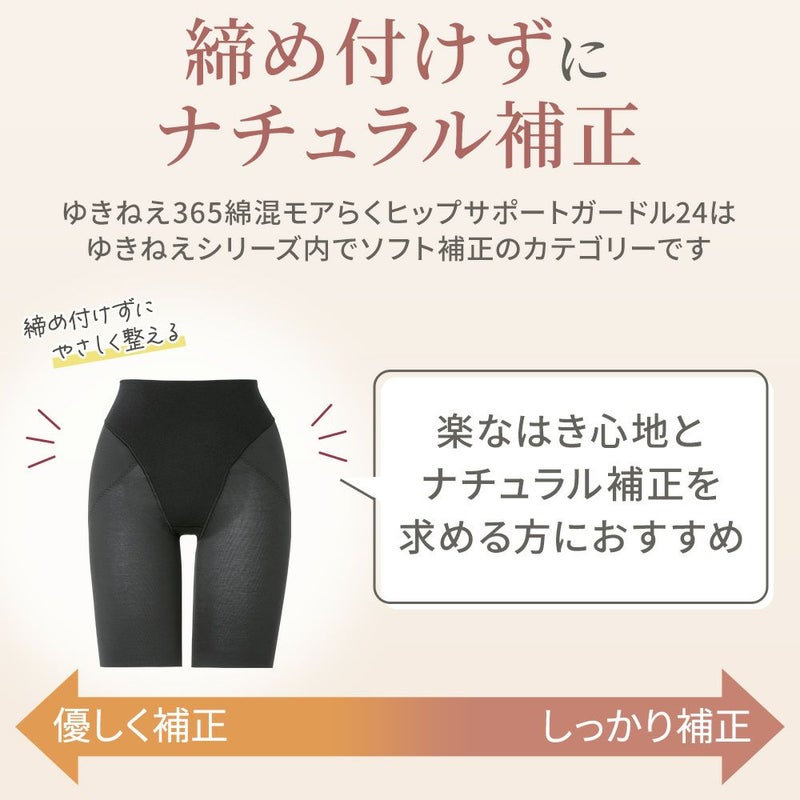 QVC商品名:ゆきねえ365綿混モアらく快適ヒップサポートガードル 大人気の補正下着ブランド「Yukine inc.」の補正ガードルです。伸縮性と機能性を兼ね備え、薄手で柔らかい身生地で365日楽で快適なはき心地です。 補整力と楽なはき心地にこだわったオリジナルパターンを採用し、心地よいシェイプ感で長時間はいても楽なはき心地です。幅広ヒップアップベルトでお尻と太ももの境目をしっかり作り、はくだけで丸みのある美しいヒップラインを作ります。ヒップの中心に施した縦ラインのテープがヒップを下から引き上げ、さらに下半分あたりに集中的に入れたギャザーにより、丸みをつぶさずきれいなヒップラインをキープします。 お腹部分はクロス設計にリニューアルされ、身生地の間にパワーネットを挟み込み、気になる部分は四重構造で効果的に補整します。ウエスト部分は、二重に折り返した生地のストレッチ性を利用し、ゴム不使用で締めつけを軽減します。また、ウエスト上部と足口部分はパワーネットをカットすることで、シェイプしながら楽にはいていただけます。フロントパネルは接ぎがない一体型パターンで、ピタッとフィットしスムーズなはき心地です。 内ももから続く幅広ヒップアップベルトは太もも全体をカバーし、ヒップを持ち上げながら美しいレッグラインに整えます。足口はヘム仕様で食い込みや段差を軽減し、フラットでアウターに響きにくくなっています。 身生地は薄手で柔らかく、優しい肌当たりの綿混素材"ナイロン綿ベア天竺"を使用し、ストレッチ性とソフトなフィット感で締め付け感が少なく楽なはき心地です。綿には上質な綿糸"スーピマ綿"を使い、なめらかな肌触りで毛玉になりにくくなっています。また、フロント・ウエスト部分に使用している生地には消臭機能がついており、さらに接触冷感、吸水速乾性を兼ね備えているので、年中サラっと快適な着心地です。 接ぎを極力なくしたスムーズ仕様のシンプルなデザインで、365日どんなシーンでも楽な着心地です。一枚ばきのソフトガードルで、苦しいガードルが苦手な方におすすめです。