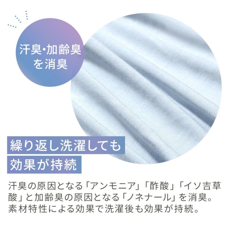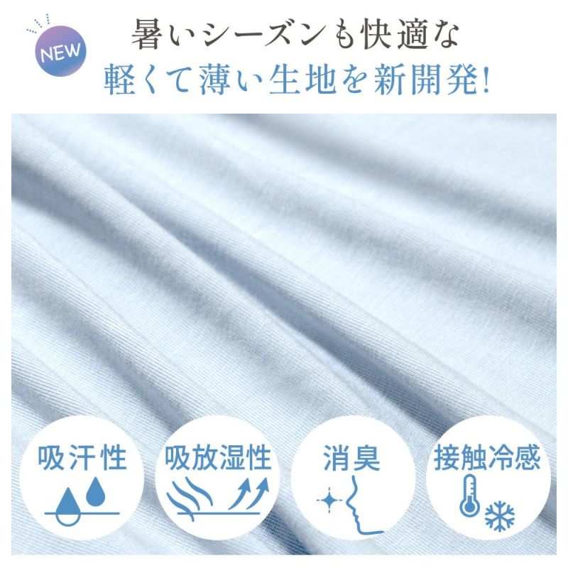 身生地は柔らかく滑らかな肌触りのシルクレーヨン混ベア天竺を使用。天然繊維であるシルクは糸が細くなめらかな肌触りを実現しました。接触冷感機能があり、触れたときにひんやり感もあります。