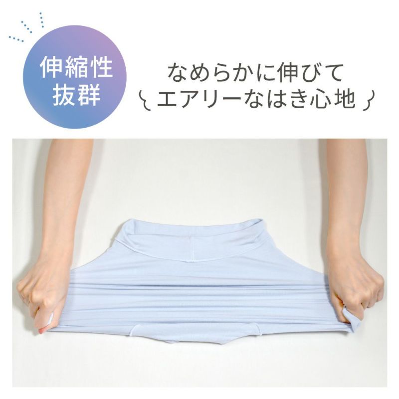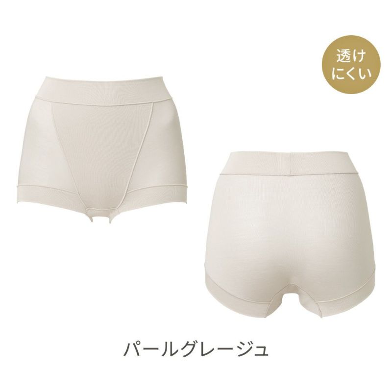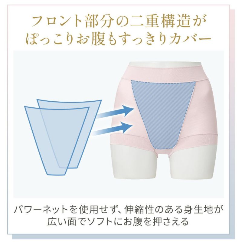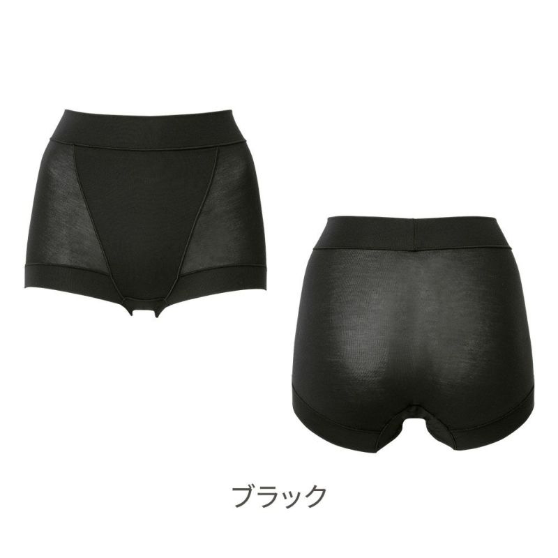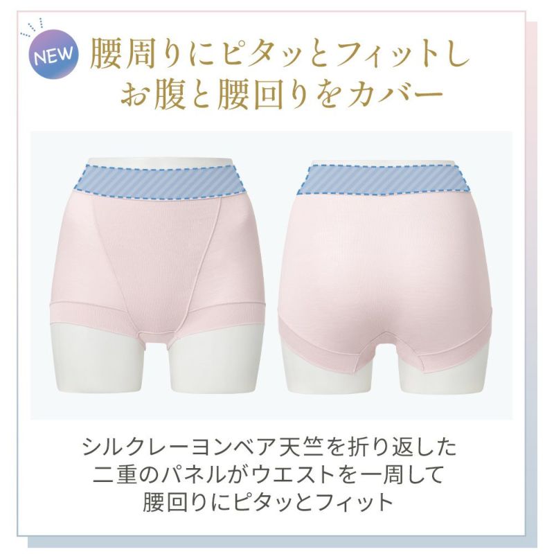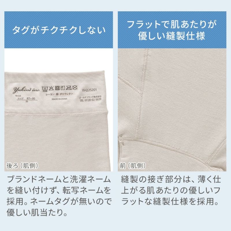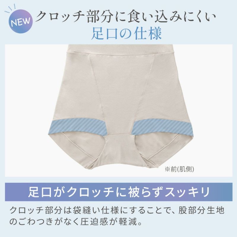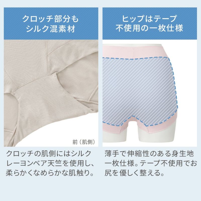 ハイウエスト丈設計で前と後身丈が長く、安定した着用感があります。ヒップは身生地をたっぷり使用した一枚仕様でお尻をすっぽりと包み込み、なめらかな肌触りで優しくヒップラインにフィット。肌に当たる縫製部分をなるべく少なくしているので縫い目を感じにくく、肌当たりが優しくなっています。