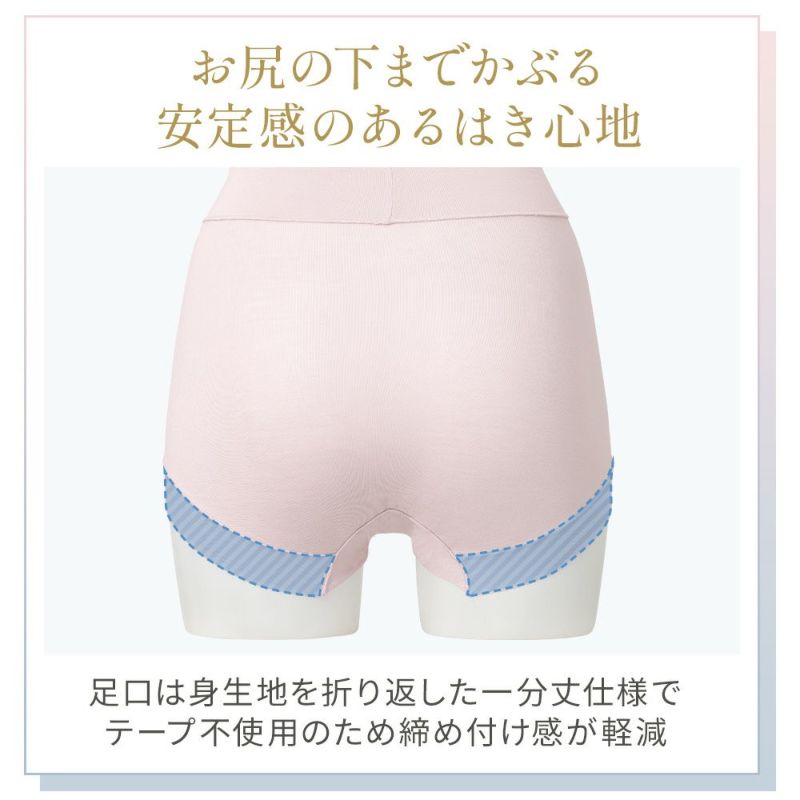 足口はそけい部からお尻まで身生地を折り返した一分丈仕様で、食い込みにくく安定感のあるはき心地。クロッチ部分は袋縫い仕様にすることで股部分のごわつきがなく圧迫感を感じにくくなっています。