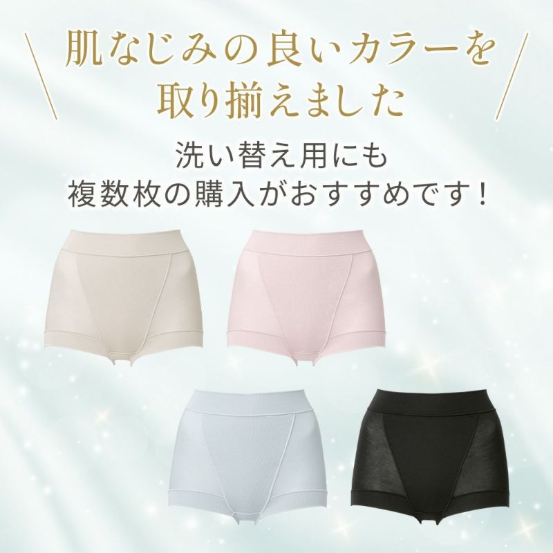 着ていることを忘れるようななめらかな肌触りの補正ショーツ。ヒップを優しく包み込み毎日のご使用にピッタリです。