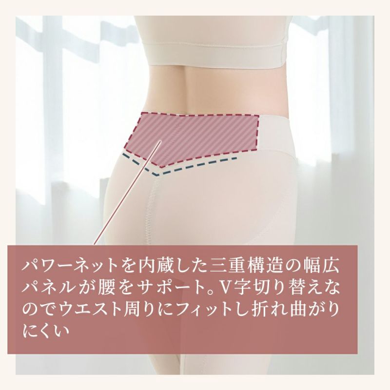内ももから続く幅広ヒップアップベルトは太もも全体をカバーし、ヒップを持ち上げながら美しいレッグラインに整えます。足口はヘム仕様で食い込みや段差を軽減し、フラットでアウターに響きにくくなっています。