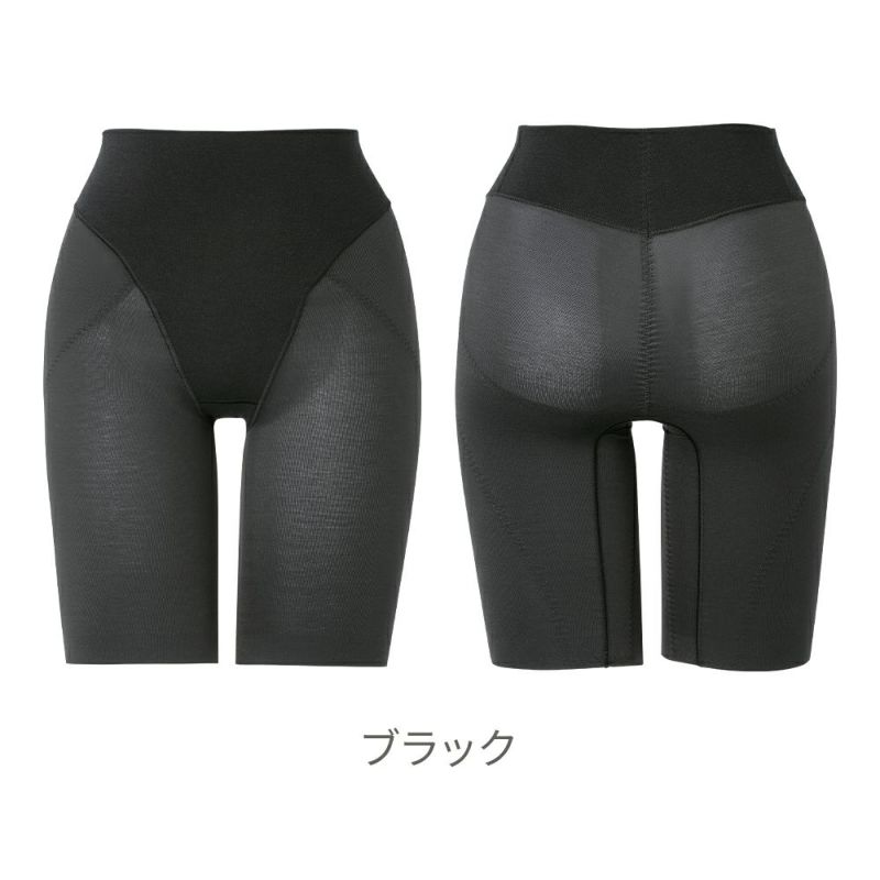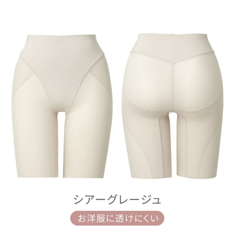 補整力と楽なはき心地にこだわったオリジナルパターンを採用し、心地よいシェイプ感で長時間はいても楽なはき心地です。幅広ヒップアップベルトでお尻と太ももの境目をしっかり作り、はくだけで丸みのある美しいヒップラインを作ります。ヒップの中心に施した縦ラインのテープがヒップを下から引き上げ、さらに下半分あたりに集中的に入れたギャザーにより、丸みをつぶさずきれいなヒップラインをキープします。