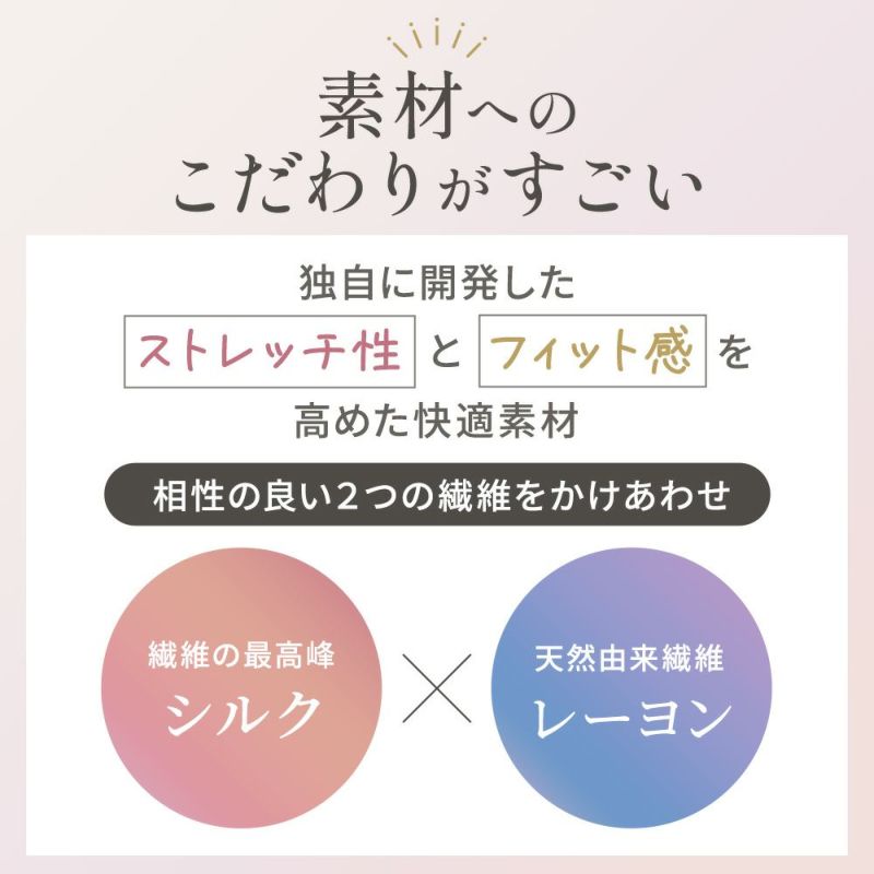 身生地には、柔らかくなめらかな肌触りのシルクレーヨン混ベア天竺を使用し、ストレッチ性とフィット感を高めた快適な素材で、着ていることを忘れるような快適さを実現。さらに、吸湿性・吸水性・放湿性に優れ、接触冷感機能付きで蒸れなどの不快感を軽減。汗臭や加齢臭に対する消臭機能もあり、汗の臭いがこもりがちなデリケートゾーンも安心です。