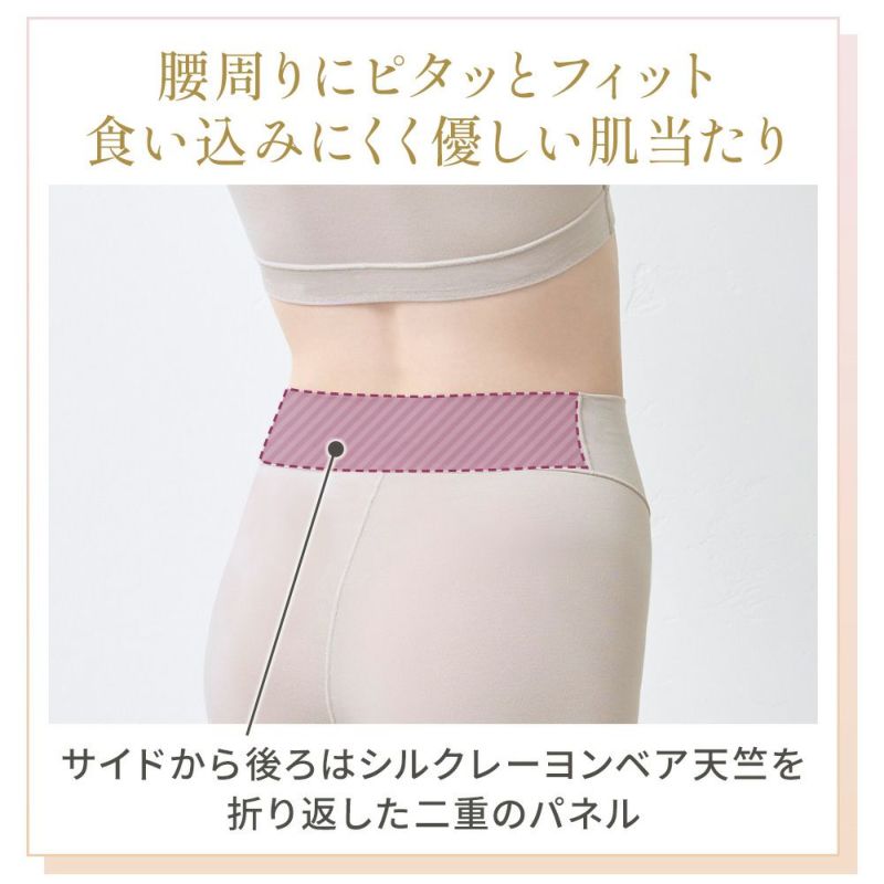 フロント部分はシルクレーヨン混ベア天竺を折り返した二重構造。おへそが隠れる安定感のあるハイウエスト設計でお腹周りをソフトに整え、テープを使用していないので食い込みにくく優しい肌当たりです。