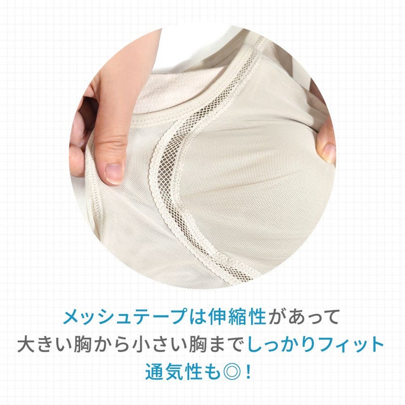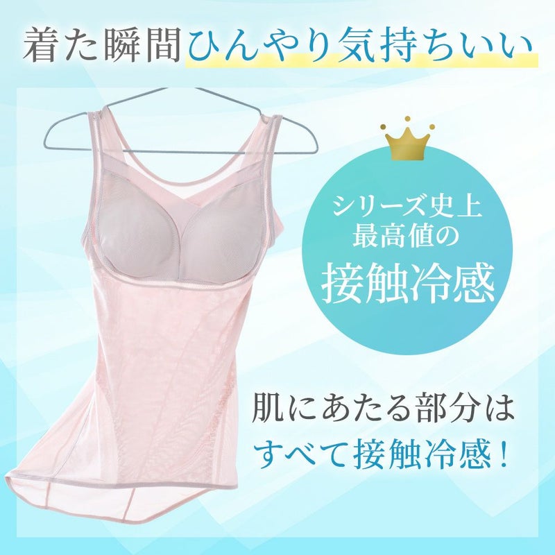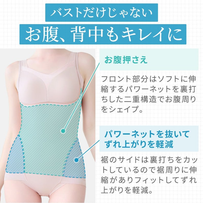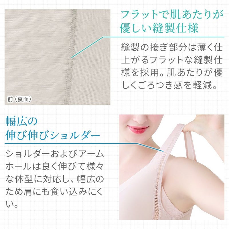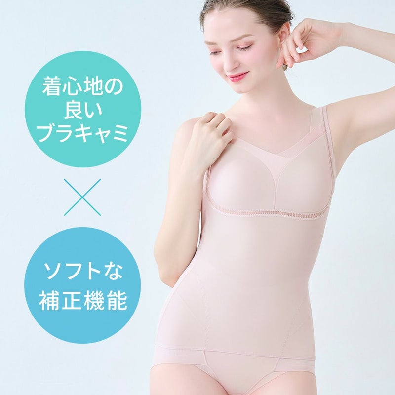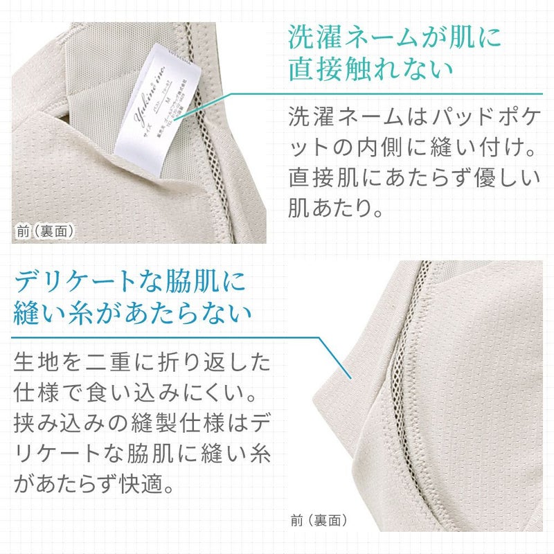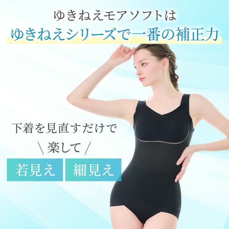 QVC商品名:ゆきねえモアソフト快適フルカップシェイプブラキャミ 大人気の補正下着ブランド「Yukine inc.」のロングセラー、モアソフト快適シリーズ。伸縮性のあるパワーネットが、楽な着心地でボディラインを美しく整える補正ブラキャミです。 ワイヤー代わりのバストアップメッシュテープがバストをしっかりと引き上げ、下垂気味のバストをリフトアップします。メッシュテープは伸縮性が高く、カップのフィット性を高めると同時にずれ上がりを防止し、幅広いバストサイズに対応します。また、サイドにあるプッシュパネルがカップの横広がりを押さえてすっきり細見えに。幅広パネルが面で支えて脇をすっきりと整えます。カップ脇にはシルクレーヨン混のメッシュ素材を使用し汗もしっかりと吸収しさらっと快適です。 身生地のパワーネットはメッシュ素材のため、通気性に優れ汗ばむ季節も快適です。さらに接触冷感機能がパワーアップし、吸汗性、消臭性、速乾性も兼ね備えてるので、暑い季節に嬉しい機能がたくさんつまっています。カップは、安定感のあるフルカップデザインでバスト全体をしっかり包み込みます。取り外し可能なパッドは通気性のある穴あきパッドで、ムレにくくなっています。 フロント部分はソフトに伸縮するパワーネットを裏打ちした二重構造で、気になるお腹をほどよく押さえます。背中は広い面で押さえることで段差なくすっきりとした綺麗なボディラインに整えます。