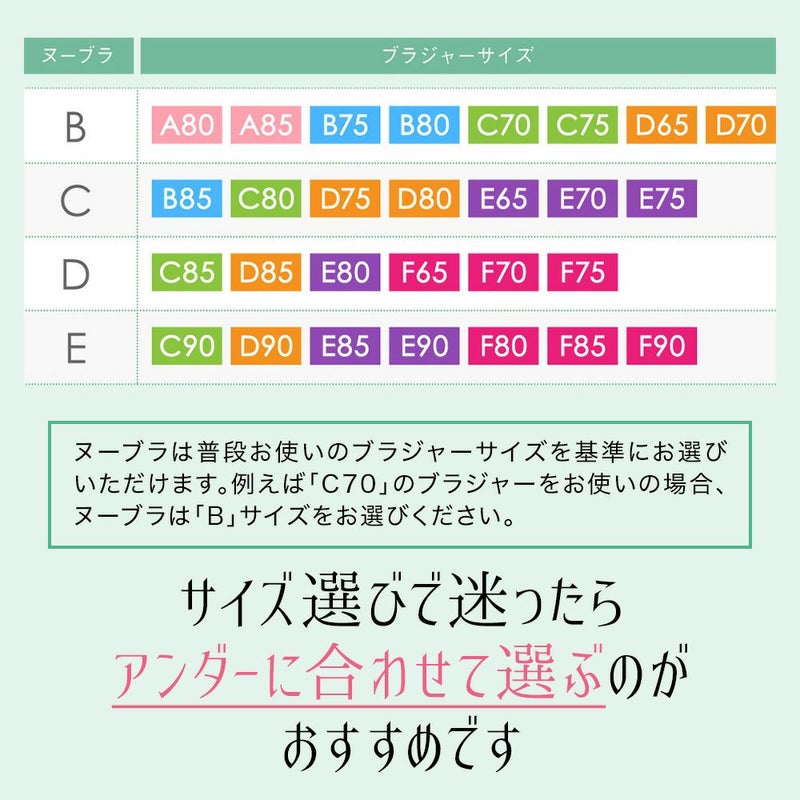 ヌーブラは普段お使いのブラジャーサイズを基準にお選びいただけます。例えば「C70」のブラジャーをお使いの場合、ヌーブラは「B」サイズをお選びください。
