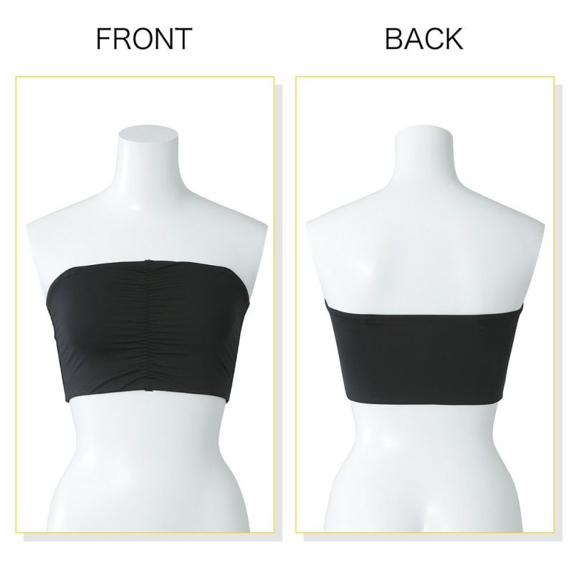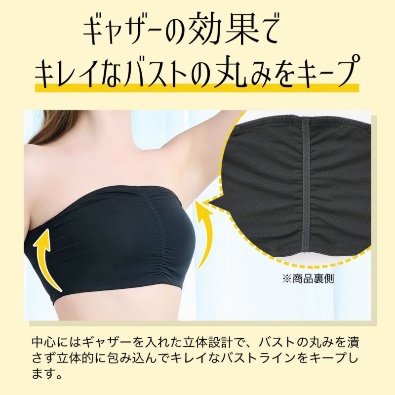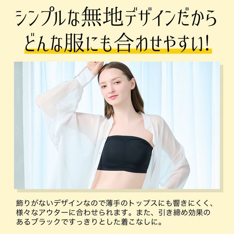 肌側がメッシュ素材でサラっと着られるチューブトップです。 ストレッチ素材でヌーブラとバストをしっかり包み込んで支えるので、ヌーブラ押さえに最適! カップなしタイプのため、ヌーブラと合わせて1枚ですっきり着られます。 中心にギャザーを入れた立体設計を採用し、バストの丸みを潰さず立体的に包み込んでキレイなバストラインをキープ。 しっかりとした高さで包み込むので、脇肉すっきり効果もあり、背中の段差もカバーします。 背中部分が大きく開いた洋服とも相性抜群◎ シンプルな無地デザインで、薄手のトップスやシャツなどでもひびきにくく、重宝するお役立ちインナーです。 ストラップタグが付いているのでお手持ちのストラップを付けて着用も可能です。(※本商品にはストラップは付属していません。)