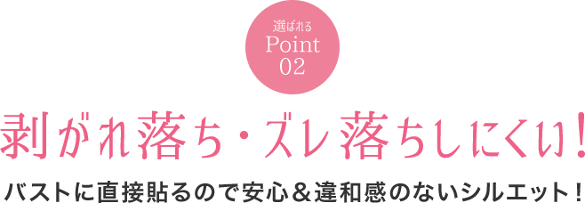 医療用にも採用されている感圧接着剤を独自の配分でシリコンと調合する事により強力な粘着力を実現。バストにぴったり密着し、ズレ落ちる心配がありません。