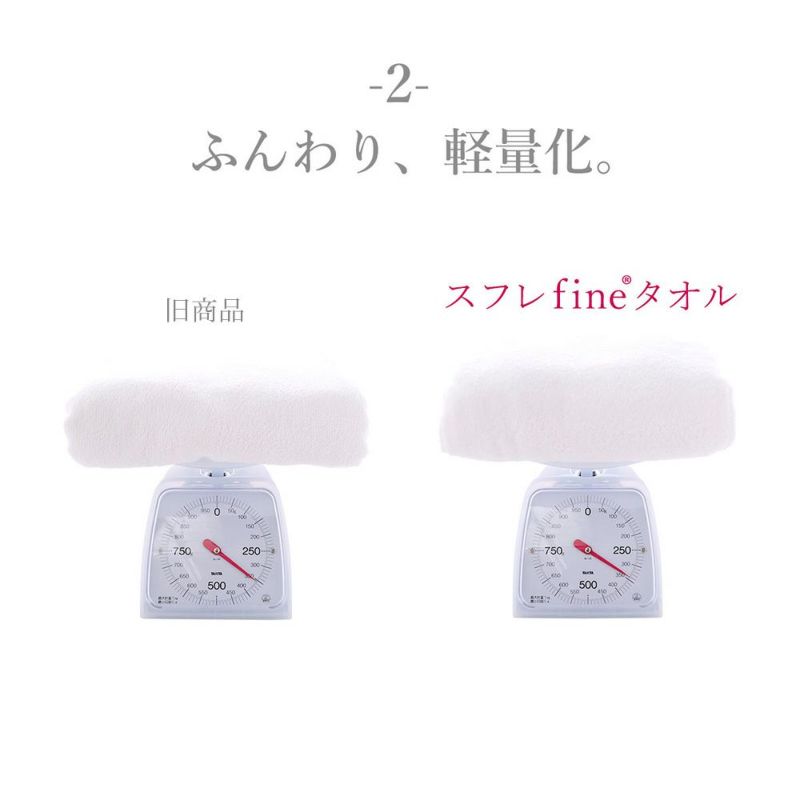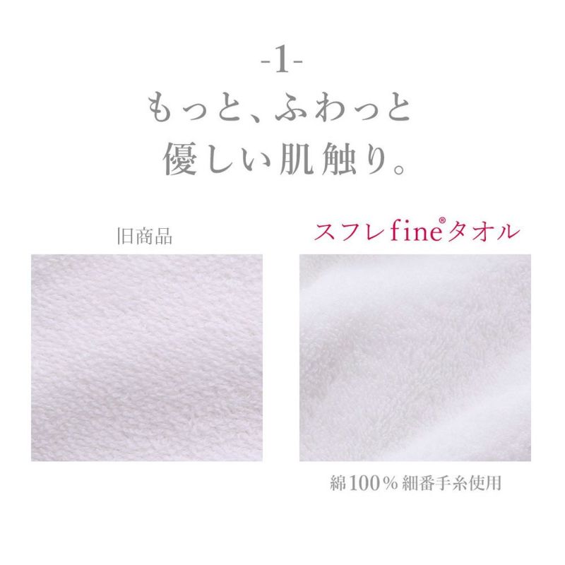 お風呂上りを快適にお過ごし頂けるよう、綿100%の優しい肌触り+吸水速乾軽量+いやな毛羽落ちを低減した「スフレfineタオル」を開発。従来品よりさらに着心地と使い勝手の良い商品に仕上げました。